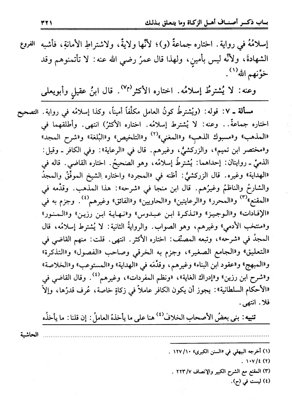 ـــــــــــــــــــــــــــــQمَسْأَلَةٌ - 7: قَوْلُهُ: وَيُشْتَرَطُ كَوْنُ الْعَامِلِ مُكَلَّفًا أَمِينًا، وَكَذَا إسْلَامُهُ فِي رِوَايَةٍ، اخْتَارَهُ جَمَاعَةٌ. وَعَنْهُ. لَا يُشْتَرَطُ إسْلَامُهُ، اخْتَارَهُ الْأَكْثَرُ، انْتَهَى، وَأَطْلَقَهُمَا فِي الْمُذْهَبِ وَمَسْبُوكِ الذَّهَبِ وَالْمُغْنِي2 وَالتَّلْخِيصِ وَالْبُلْغَةِ وَشَرْحِ الْمَجْدِ وَمُخْتَصَرِ ابْنِ تَمِيمٍ وَالزَّرْكَشِيِّ وَغَيْرِهِمْ، قَالَ فِي الرِّعَايَةِ: وَفِي الْكَافِرِ وَقِيلَ الذِّمِّيُّ رِوَايَتَانِ، إحْدَاهُمَا يُشْتَرَطُ إسْلَامُهُ، وَهُوَ الصَّحِيحُ اخْتَارَهُ الْقَاضِي، قَالَهُ فِي الْهِدَايَةِ وَغَيْرِهِ، قَالَ الزَّرْكَشِيّ: أَظُنُّهُ فِي الْمُجَرَّدِ، وَاخْتَارَهُ الشَّيْخُ الْمُوَفَّقُ وَالْمَجْدُ وَالشَّارِحُ وَالنَّاظِمُ وَغَيْرِهِمْ، قَالَ ابْنُ مُنَجَّى فِي شَرْحِهِ: هَذَا الْمَذْهَبِ، وَقَدَّمَهُ فِي الْمُقْنِعِ3 وَالْمُحَرَّرِ وَالرِّعَايَتَيْنِ وَالْحَاوِيَيْنِ وَالْفَائِقِ وَغَيْرِهِمْ4. وَجَزَمَ بِهِ فِي الْإِفَادَاتِ وَالْوَجِيزِ وَتَذْكِرَةِ ابْنِ عَبْدُوسٍ وَنِهَايَةِ ابْنِ رَزِينٍ وَالْمُنَوِّرِ وَمُنْتَخَبِ الْآدَمِيِّ وَغَيْرِهِمْ، وَهُوَ الصَّوَابُ، وَالرِّوَايَةُ الثَّانِيَةُ لَا يُشْتَرَطُ إسْلَامُهُ. قَالَ الْمَجْدُ فِي شَرْحِهِ وَتَبِعَهُ الْمُصَنِّفُ اخْتَارَهُ الْأَكْثَرُ، انْتَهَى قُلْت مِنْهُمْ الْقَاضِي فِي التَّعْلِيقِ وَالْجَامِعِ الصَّغِيرِ، وَجَزَمَ بِهِ الْخِرَقِيُّ وَصَاحِبُ الْفُصُولِ وَالتَّذْكِرَةِ وَالْمُبْهِجِ وَعُقُودِ ابْنِ الْبَنَّاءِ وَغَيْرُهُمْ، وَقَدَّمَهُ فِي الْهِدَايَةِ وَالْمُسْتَوْعِبِ وَالْخُلَاصَةِ وَشَرْحِ ابْنِ رَزِينٍ وَإِدْرَاكِ الْغَايَةِ وَنَظْمِ الْمُفْرَدَاتِ وَغَيْرِهِمْ4. وَقَالَ الْقَاضِي فِي الْأَحْكَامِ السُّلْطَانِيَّةِ: يَجُوزُ أَنْ يَكُونَ الْكَافِرُ عَامِلًا فِي زَكَاةٍ خَاصَّةٍ عُرِفَ قَدْرُهَا وَإِلَّا فَلَا، انْتَهَى.