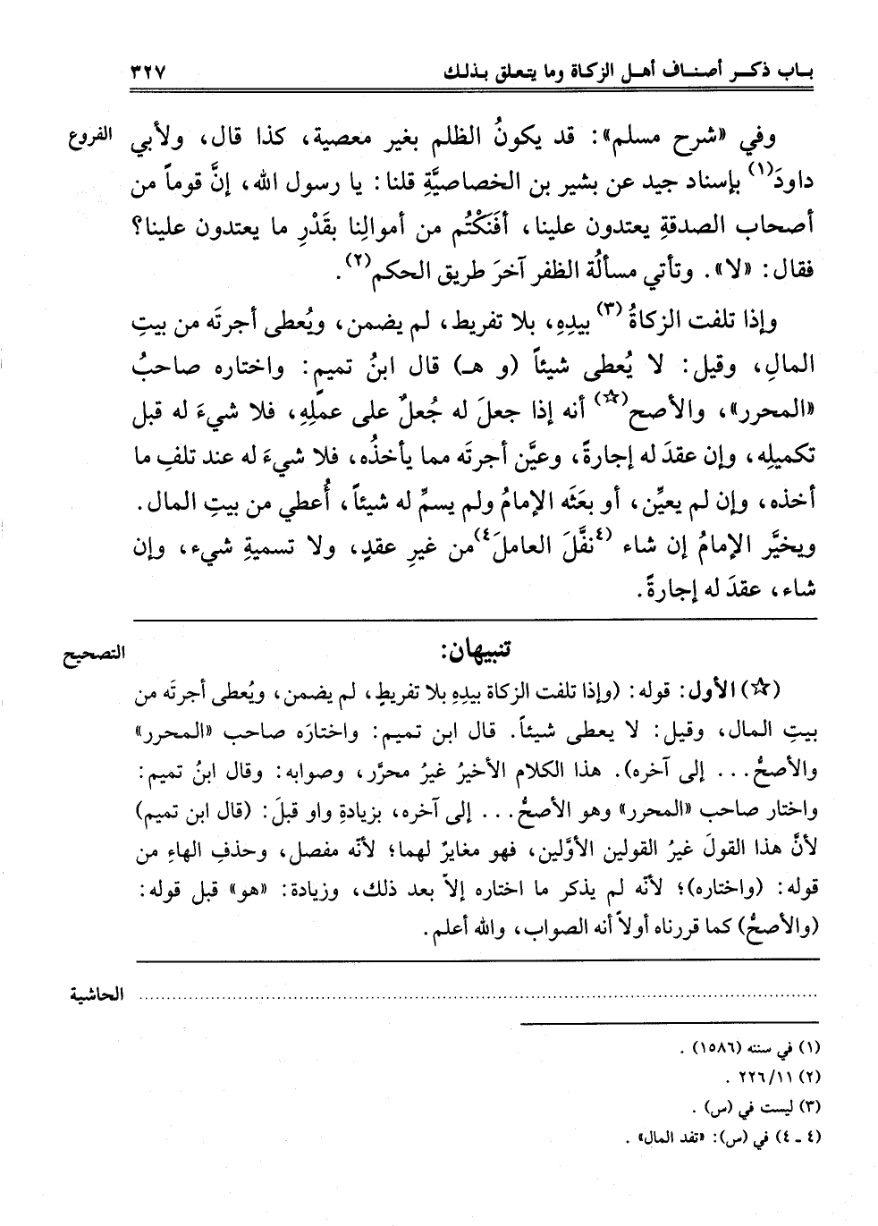 "*" الْأَوَّلُ: قَوْلُهُ: وَإِذَا تَلْفِتْ الزَّكَاةُ بِيَدِهِ بِلَا تَفْرِيطٍ لَمْ يَضْمَنْ، وَيُعْطَى أُجْرَتَهُ مِنْ بَيْتِ الْمَالِ، وَقِيلَ: لَا يُعْطَى شَيْئًا، قَالَ ابْنُ تَمِيمٍ: وَاخْتَارَهُ صَاحِبُ الْمُحَرَّرِ، وَالْأَصَحُّ إلَى آخره هَذَا الْكَلَامُ الْأَخِيرُ غَيْرُ مُحَرَّرٍ، وَصَوَابُهُ: وَقَالَ ابْنُ تَمِيمٍ: وَاخْتَارَ صَاحِبُ الْمُحَرَّرِ وَهُوَ الْأَصَحُّ إلَى آخِرِهِ، بِزِيَادَةِ وَاوٍ قَبْلُ، قَالَ ابْنُ تَمِيمٍ لِأَنَّ هَذَا الْقَوْلَ غَيْرُ الْقَوْلَيْنِ الْأَوَّلَيْنِ، فَهُوَ مُغَايِرٌ لَهُمَا، لِأَنَّهُ مُفَصَّلٌ، وَحَذَفَ الْهَاءَ مِنْ قَوْلِهِ، وَاخْتَارَهُ، لِأَنَّهُ لَمْ يَذْكُرْ مَا اخْتَارَهُ إلَّا بَعْدَ ذَلِكَ، وَزِيَادَةِ هُوَ قَبْلَ قوله والأصح كما قررناه أولا، أنه الصواب والله أعلم.