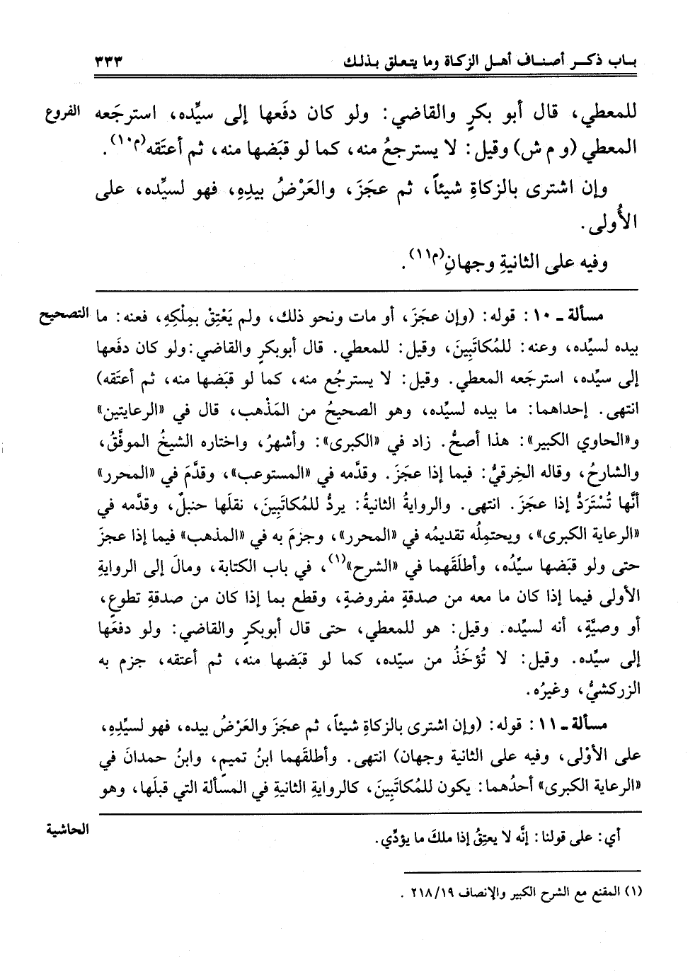 مَسْأَلَةٌ - 11: قَوْلُهُ: وَإِنْ اشْتَرَى بِالزَّكَاةِ شَيْئًا ثُمَّ عَجَزَ وَالْعِوَضُ بِيَدِهِ فَهُوَ لِسَيِّدِهِ عَلَى الْأَوْلَى، وَفِيهِ عَلَى الثَّانِيَةِ وَجْهَانِ، انْتَهَى. وَأَطْلَقَهُمَا ابْنُ تَمِيمٍ وَابْنُ حَمْدَانَ في الرِّعَايَةِ الْكُبْرَى، أَحَدُهُمَا يَكُونُ لِلْمُكَاتِبِينَ، كَالرِّوَايَةِ الثَّانِيَةِ في المسألة التي قبلها، وهو