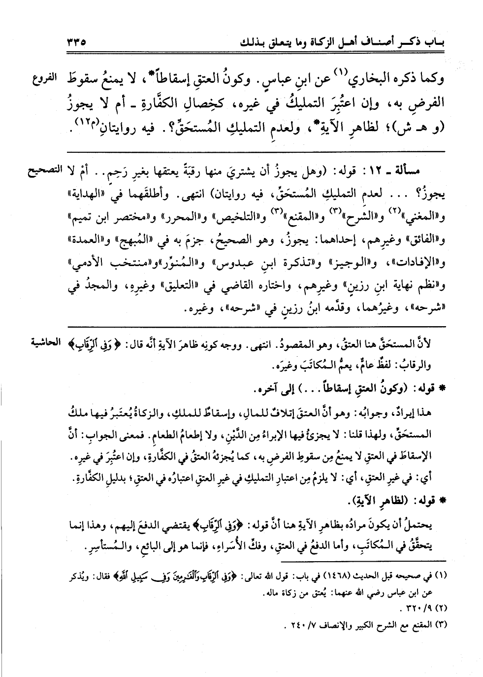 وَكَمَا ذَكَرَهُ الْبُخَارِيُّ1 عَنْ ابْنِ عَبَّاسٍ، وَكَوْنُ الْعِتْقِ إسْقَاطًا لَا يَمْنَعُ سُقُوطَ الْفَرْضِ بِهِ وَإِنْ اُعْتُبِرَ التَّمْلِيكُ فِي غَيْرِهِ كَخِصَالِ الْكَفَّارَةِ أم لا يجوز؛ "وهـ ش" لِظَاهِرِ الْآيَةِ، وَلِعَدَمِ التَّمْلِيكِ الْمُسْتَحَقِّ، فِيهِ روايتان "م 12".