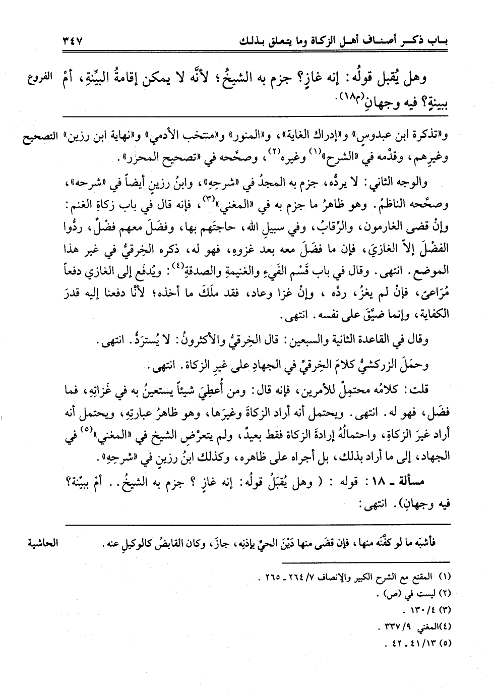 وَحَمَلَ الزَّرْكَشِيّ كَلَامَ الْخِرَقِيِّ فِي الْجِهَادِ عَلَى غَيْرِ الزَّكَاةِ. انْتَهَى.