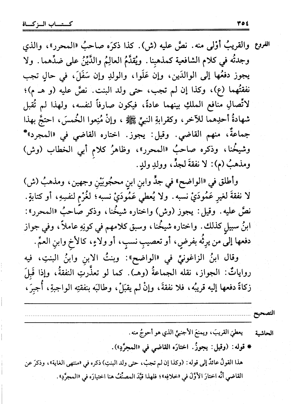 وَالْقَرِيبُ أَوْلَى مِنْهُ. نَصَّ عَلَيْهِ "ش" كَذَا ذَكَرَهُ صَاحِبُ الْمُحَرَّرِ، وَاَلَّذِي وَجَدْته فِي كَلَامِ الشَّافِعِيَّةِ كَمَذْهَبِنَا، وَيُقَدَّمُ الْعَالِمُ وَالدَّيِّنُ عَلَى ضِدِّهِمَا، وَلَا يَجُوزُ دَفْعُهَا إلَى الْوَالِدَيْنِ وَإِنْ عَلَوَا وَالْوَلَدُ وَإِنْ سَفَلَ فِي حَالٍ تَجِبُ نَفَقَتُهُمَا "ع" وَكَذَا إنْ لَمْ تُجِبْ، حَتَّى وَلَدِ الْبِنْتِ، نَصَّ عَلَيْهِ "وهـ م" لِاتِّصَالِ مَنَافِعِ الْمِلْكِ بَيْنَهُمَا عَادَةً، فَيَكُونُ صَارِفًا لِنَفْسِهِ، وَلِهَذَا لَمْ تُقْبَلْ شَهَادَةُ أَحَدِهِمَا لِلْآخَرِ، وَكَقَرَابَةِ النَّبِيِّ صَلَّى اللَّهُ عَلَيْهِ وَسَلَّمَ وَإِنْ مُنِعُوا الْخُمُسَ، احْتَجَّ بِهَذَا جَمَاعَةٌ مِنْهُمْ الْقَاضِي، وَقِيلَ: يَجُوزُ، اخْتَارَهُ الْقَاضِي فِي الْمُجَرَّدِ وَشَيْخُنَا، وَذَكَرَهُ صَاحِبُ الْمُحَرَّرِ، وَظَاهِرُ كَلَامِ أَبِي الْخَطَّابِ "وش" وَمَذْهَبُ "م": لَا نَفَقَةَ لِجَدٍّ وَوَلَدِ وَلَدٍ.
