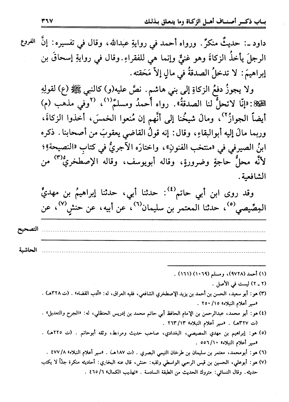 وَلَا يَجُوزُ دَفْعُ الزَّكَاةِ إلَى بَنِي هَاشِمٍ، نَصَّ عَلَيْهِ "و" كَالنَّبِيِّ صَلَّى اللَّهُ عَلَيْهِ وَسَلَّمَ "ع" لِقَوْلِهِ عَلَيْهِ السَّلَامُ: "إنَّا لَا تَحِلُّ لَنَا الصَّدَقَةُ". رَوَاهُ أَحْمَدُ وَمُسْلِمٌ1، 2"وَفِي مَذْهَبِ "م" أَيْضًا الْجَوَازُ"2، وَمَالَ شَيْخُنَا إلَى أَنَّهُمْ إنْ مُنِعُوا الْخُمُسَ أَخَذُوا الزَّكَاةَ، وَرُبَّمَا مَالَ إلَيْهِ أَبُو الْبَقَاءِ. وَقَالَ: إنَّهُ قَوْلُ الْقَاضِي يَعْقُوبَ مِنْ أَصْحَابِنَا، ذَكَرَهُ ابْنُ الصَّيْرَفِيِّ فِي مُنْتَخَبِ الْفُنُونِ، وَاخْتَارَهُ الْآجُرِّيُّ فِي كِتَابِ النَّصِيحَةِ؛ لِأَنَّهُ مَحَلُّ حَاجَةٍ وَضَرُورَةٍ وَقَالَهُ أَبُو يُوسُفَ. وَقَالَهُ الْإِصْطَخْرِيُّ3 مِنْ الشَّافِعِيَّةِ.