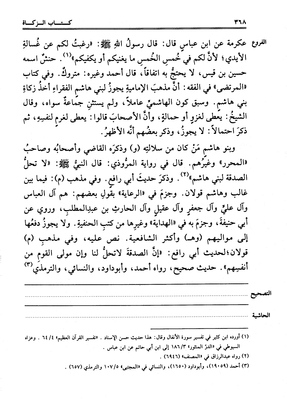 عِكْرِمَةَ عَنْ ابْنِ عَبَّاسٍ قَالَ: قَالَ رَسُولُ اللَّهِ صَلَّى اللَّهُ عَلَيْهِ وَسَلَّمَ: "رَغِبْت لَكُمْ عَنْ غُسَالَةِ الْأَيْدِي؛ لِأَنَّ لَكُمْ فِي خُمُسِ الْخُمُسِ مَا يُغْنِيكُمْ أَوْ يَكْفِيكُمْ" 1. حَنَشٌ اسْمُهُ حُسَيْنُ بْنُ قَيْسٍ، لَا يُحْتَجُّ بِهِ اتِّفَاقًا، قَالَ أَحْمَدُ وَغَيْرُهُ: مَتْرُوكٌ، وَفِي كِتَابِ الْمُرْتَضَى فِي الْفِقْهِ أَنَّ مَذْهَبَ الْإِمَامِيَّةِ يَجُوزُ لِبَنِي هَاشِمٍ الْفُقَرَاءِ أَخْذُ زَكَاةِ بَنِي هَاشِمٍ، وَسَبَقَ كَوْنُ الْهَاشِمِيِّ عَامِلًا، وَلَمْ يَسْتَثْنِ جَمَاعَةً سِوَاهُ. وَقَالَ الشَّيْخُ: يُعْطَى لِغَزْوٍ أَوْ حَمَالَةٍ، وَأَنَّ الْأَصْحَابَ قَالُوا: يُعْطَى لِغُرْمِ لِنَفْسِهِ، ثُمَّ ذَكَرَ احتمالا: لا يجوز، وذكر بعضهم أنه الأظهر.