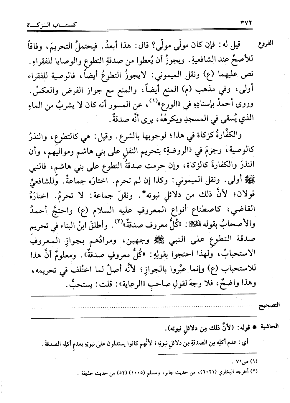 وَالْكَفَّارَةُ كَزَكَاةٍ فِي هَذَا، لِوُجُوبِهَا بِالشَّرْعِ، وَقِيلَ: هِيَ كَالتَّطَوُّعِ، وَالنَّذْرُ كَالْوَصِيَّةِ، وَجَزَمَ فِي الرَّوْضَةِ بِتَحْرِيمِ النَّفْلِ عَلَى بَنِي هَاشِمٍ وَمَوَالِيهِمْ، وَأَنَّ النَّذْرَ وَالْكَفَّارَةَ كَالزَّكَاةِ، وَإِنْ حُرِّمَتْ صَدَقَةُ التَّطَوُّعِ عَلَى بَنِي هَاشِمٍ فَالنَّبِيُّ صَلَّى اللَّهُ عَلَيْهِ وَسَلَّمَ أَوْلَى، وَنَقَلَ الْمَيْمُونِيُّ: وَكَذَا إنْ لَمْ تَحْرُمْ، اخْتَارَهُ جَمَاعَةٌ، وَلِلشَّافِعِيِّ قَوْلَانِ؛ لِأَنَّ ذَلِكَ مِنْ دَلَائِلِ نُبُوَّتِهِ، وَنَقَلَ جَمَاعَةٌ: لَا تَحْرُمُ، اخْتَارَهُ الْقَاضِي، كَاصْطِنَاعِ أَنْوَاعِ الْمَعْرُوفِ إلَيْهِ عَلَيْهِ السَّلَامُ "ع" وَاحْتَجَّ أَحْمَدُ وَالْأَصْحَابُ بِقَوْلِهِ عَلَيْهِ السَّلَامُ: "كُلُّ مَعْرُوفٍ صَدَقَةٌ" 2. وَأَطْلَقَ ابْنُ الْبَنَّا فِي تَحْرِيمِ صَدَقَةِ التَّطَوُّعِ عَلَى النَّبِيِّ صَلَّى اللَّهُ عَلَيْهِ وَسَلَّمَ وَجْهَيْنِ، وَمُرَادُهُمْ بِجَوَازِ الْمَعْرُوفِ الِاسْتِحْبَابُ، وَلِهَذَا احْتَجُّوا بِقَوْلِهِ: "كُلُّ مَعْرُوفٍ صَدَقَةٌ". وَمَعْلُومٌ أَنَّ هَذَا لِلِاسْتِحْبَابِ "ع" وَإِنَّمَا عَبَّرُوا بِالْجَوَازِ؛ لِأَنَّهُ أَصْلٌ لِمَا اُخْتُلِفَ فِي تَحْرِيمِهِ، وَهَذَا وَاضِحٌ، فَلَا وَجْهَ لِقَوْلِ صاحب الرعاية: قلت: يستحب.