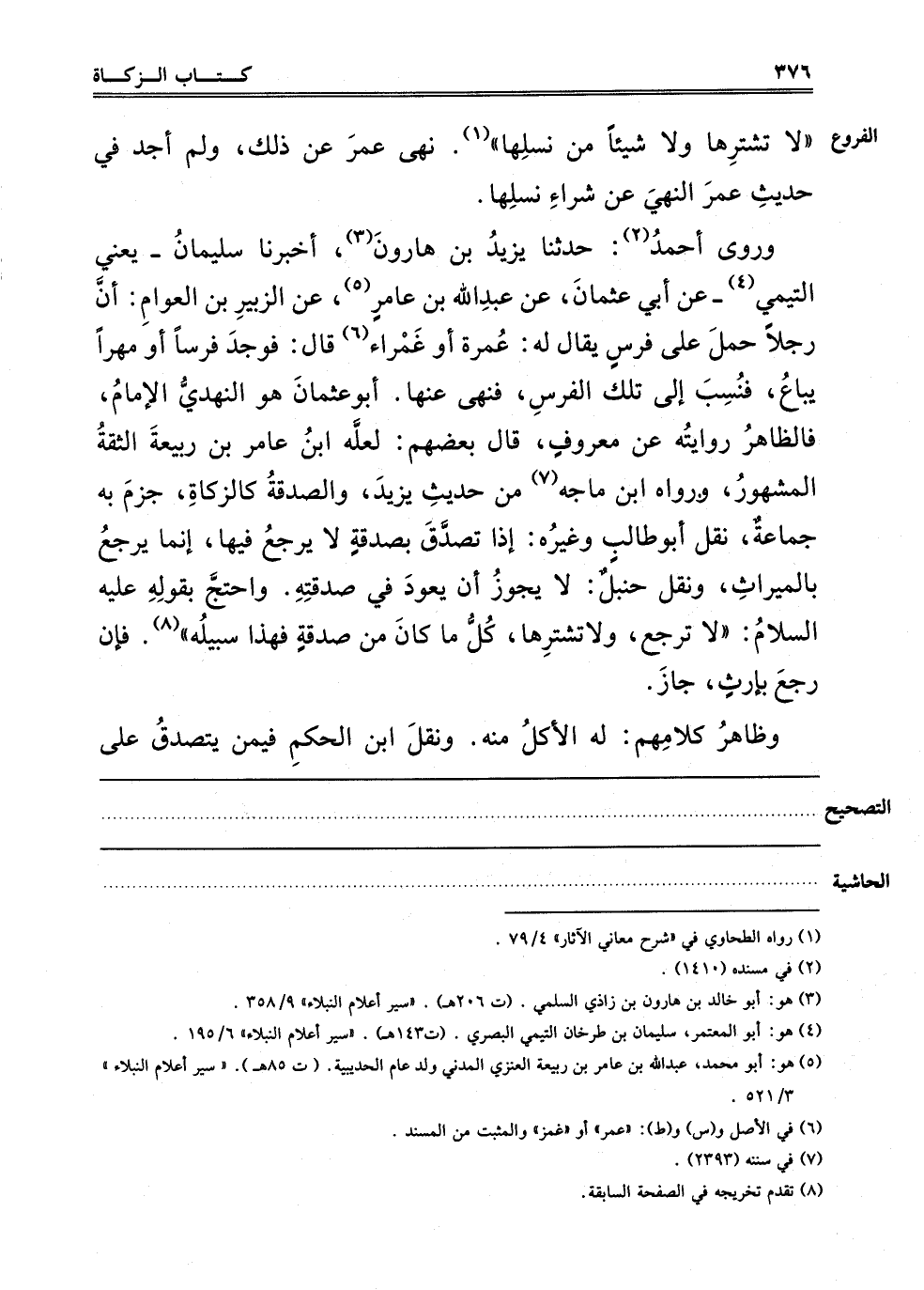 وَرَوَى أَحْمَدُ2: حَدَّثَنَا يَزِيدُ بْنُ هَارُونَ3، أَخْبَرَنَا سُلَيْمَانُ يَعْنِي التَّيْمِيَّ4 عَنْ أَبِي عُثْمَانَ، عَنْ عَبْدِ اللَّهِ بْنِ عَامِرٍ5، عَنْ الزُّبَيْرِ بْنِ الْعَوَّامِ أَنَّ رَجُلًا حَمَلَ عَلَى فَرَسٍ يُقَالُ لَهُ غَمْرَةُ أَوْ غَمْرَاءُ6 قَالَ. فَوَجَدَ فَرَسًا أَوْ مُهْرًا يُبَاعُ، فَنُسِبَ إلَى تِلْكَ الْفَرَسِ، فَنَهَى عَنْهَا. أَبُو عُثْمَانَ هُوَ النَّهْدِيُّ الْإِمَامُ، فَالظَّاهِرُ رِوَايَتُهُ عَنْ مَعْرُوفٍ، قَالَ بَعْضُهُمْ: لَعَلَّهُ ابْنُ عَامِرِ بْنِ رَبِيعَةَ الثِّقَةُ الْمَشْهُورُ، وَرَوَاهُ ابْنُ مَاجَهْ7 مِنْ حَدِيثِ يَزِيدَ، وَالصَّدَقَةُ كَالزَّكَاةِ، وَجَزَمَ بِهِ جَمَاعَةٌ، نَقَلَ أَبُو طَالِبٍ وَغَيْرِهِ: إذَا تَصَدَّقَ بِصَدَقَةٍ لَا يَرْجِعُ فِيهَا، إنَّمَا يَرْجِعُ بِالْمِيرَاثِ، وَنَقَلَ حَنْبَلٌ: لَا يَجُوزُ أَنْ يَعُودَ فِي صَدَقَتِهِ. وَاحْتَجَّ بِقَوْلِهِ عَلَيْهِ السَّلَامُ: "لَا تَرْجِعُ وَلَا تَشْتَرِهَا، كُلُّ مَا كَانَ مِنْ صَدَقَةٍ فَهَذَا سَبِيلُهُ" 8. فَإِنْ رَجَعَ بِإِرْثٍ جَازَ.