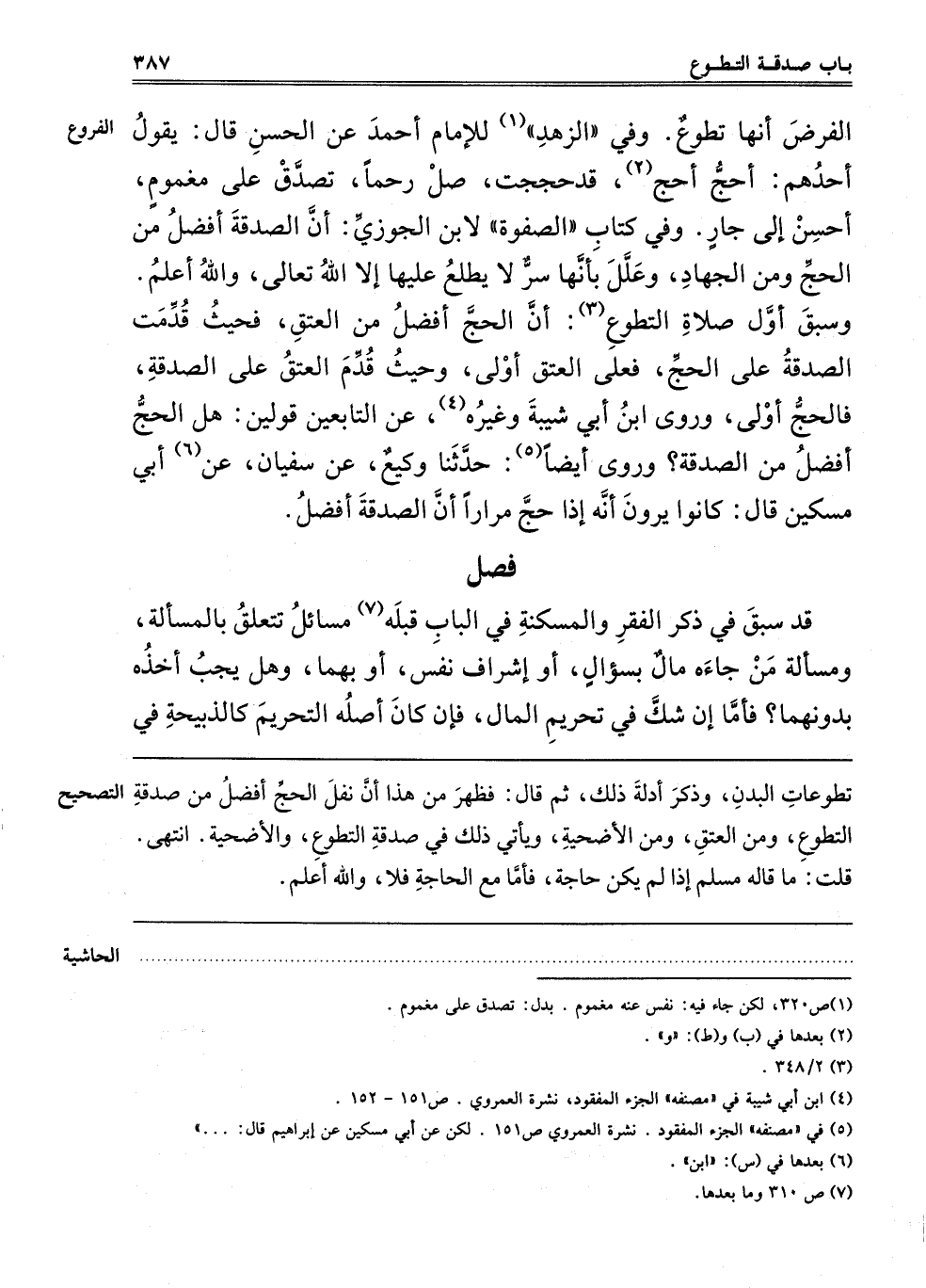 الْفَرْضَ أَنَّهَا تَطَوُّعٌ، وَفِي الزُّهْدِ1 لِلْإِمَامِ أَحْمَدَ عَنْ الْحَسَنِ قَالَ، يَقُولُ أَحَدُهُمْ: أَحُجُّ أَحُجُّ2، قَدْ حَجَجْت، صِلْ رَحِمًا، تَصَدَّقْ عَلَى مَغْمُومٍ، أَحْسِنْ إلَى جَارٍ. وَفِي كِتَابِ الصُّفْوَةِ لِابْنِ الْجَوْزِيِّ أَنَّ الصَّدَقَةَ أَفْضَلُ مِنْ الْحَجِّ وَمِنْ الْجِهَادِ، وَعَلَّلَ بِأَنَّهَا سِرٌّ لَا يَطَّلِعُ عَلَيْهَا إلَّا اللَّهُ تَعَالَى، وَاَللَّهُ أَعْلَمُ، وَسَبَقَ أَوَّلُ صَلَاةِ التَّطَوُّعِ3: أَنَّ الْحَجَّ أَفْضَلُ مِنْ الْعِتْقِ، فَحَيْثُ قُدِّمَتْ الصَّدَقَةُ عَلَى الْحَجِّ فَعَلَى الْعِتْقِ أَوْلَى، وَحَيْثُ قُدِّمَ الْعِتْقُ عَلَى الصَّدَقَةِ فَالْحَجُّ أَوْلَى، وَرَوَى ابْنُ أَبِي شَيْبَةَ وَغَيْرُهُ4، عَنْ التَّابِعِينَ قَوْلَيْنِ: هَلْ الْحَجُّ أَفْضَلُ مِنْ الصَّدَقَةِ؟ وَرَوَى أَيْضًا5: حَدَّثَنَا وَكِيعٌ عَنْ سُفْيَانَ عَنْ6 أَبِي مِسْكِينٍ قَالَ: كَانُوا يَرَوْنَ أَنَّهُ إذَا حج مرارا أن الصدقة أفضل