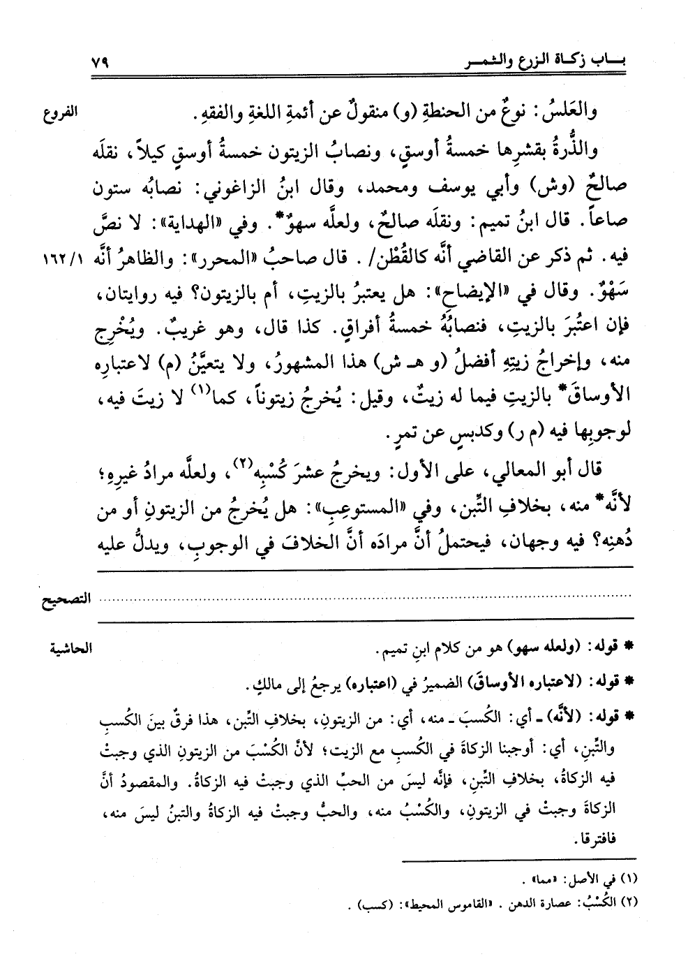 وَالذُّرَةُ بِقِشْرِهَا خَمْسَةُ أَوْسُقٍ. وَنِصَابُ الزَّيْتُونِ خَمْسَةُ أَوْسُقٍ كَيْلًا، نَقَلَهُ صَالِحٌ "وش" وَأَبِي يُوسُفَ وَمُحَمَّدٍ. وَقَالَ ابْنُ الزَّاغُونِيِّ: نِصَابُهُ سِتُّونَ صَاعًا، قَالَ ابْنُ تَمِيمٍ، وَنَقَلَهُ صَالِحٌ: وَلَعَلَّهُ سَهْوٌ. وَفِي الْهِدَايَةِ: لَا نَصَّ فِيهِ، ثُمَّ ذُكِرَ عَنْ الْقَاضِي أَنَّهُ كَالْقُطْنِ، قَالَ صَاحِبُ الْمُحَرَّرِ: وَالظَّاهِرُ أَنَّهُ سَهْوٌ. وَقَالَ فِي الْإِيضَاحِ: هَلْ يُعْتَبَرُ بِالزَّيْتِ؟ أَوْ بِالزَّيْتُونِ؟ فِيهِ رِوَايَتَانِ، فَإِنْ اُعْتُبِرَ بِالزَّيْتِ فَنِصَابُهُ خَمْسَةُ أَفْرَاقٍ كَذَا قَالَ، وَهُوَ غَرِيبٌ، وَيُخْرِجُ مِنْهُ، وَإِخْرَاجُ زَيْتِهِ أَفْضَلُ "وهـ ش" هَذَا الْمَشْهُورُ، وَلَا يَتَعَيَّنُ "م" لِاعْتِبَارِهِ الْأَوْسَاقَ بِالزَّيْتِ فِيمَا لَهُ زَيْتٌ، وَقِيلَ: يُخْرِجُ زَيْتُونًا، كَمَا1 لَا زَيْتَ فِيهِ، لِوُجُوبِهَا فِيهِ "م ر" وَكَدُبْسٍ عَنْ تَمْرٍ،
