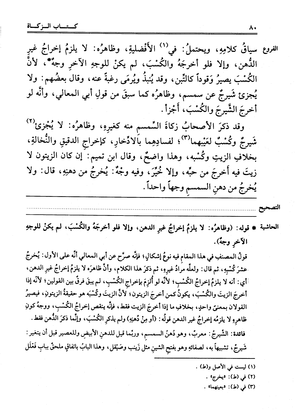 وقد وذكر الأصحاب زكاة السمسم منه كغيره، وظاهره: لا يجزئ2 شيرج وكسب لعيبهما3، لِفَسَادِهِمَا بِالِادِّخَارِ، كَإِخْرَاجِ الدَّقِيقِ وَالنُّخَالَةِ، بِخِلَافِ الزَّيْتِ وَكُسْبِهِ، وَهَذَا وَاضِحٌ. وَقَالَ ابْنُ تَمِيمٍ: إنْ كَانَ الزَّيْتُونُ لَا زَيْتَ فِيهِ أُخْرِجَ حَبُّهُ، وَإِلَّا خُيِّرَ، وَفِيهِ وَجْهٌ: يُخْرَجُ مِنْ دُهْنِهِ، قَالَ: وَلَا يُخْرَجُ مِنْ دُهْنِ السِّمْسِمِ وَجْهًا واحدا
