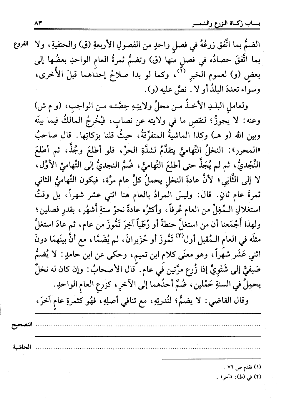 قَالَ صَاحِبُ الْمُحَرَّرِ: النَّخْلُ التِّهَامِيُّ يَتَقَدَّمُ لِشِدَّةِ الْحَرِّ، فَلَوْ أَطْلَعَ وَجُذَّ، ثُمَّ أَطْلَعَ النَّجْدِيُّ، ثُمَّ لَمْ يُجَذَّ حَتَّى أَطْلَعَ التِّهَامِيُّ، ضُمَّ النَّجْدِيُّ إلَى التِّهَامِيِّ الْأَوَّلِ لَا إلَى الثَّانِي؛ لِأَنَّ عَادَةَ النَّخْلِ يَحْمِلُ كُلَّ عَامٍ مَرَّةً، فَيَكُونُ التِّهَامِيُّ الثَّانِي ثَمَرَةَ عَامٍ ثَانٍ، قَالَ: وَلَيْسَ الْمُرَادُ بِالْعَامِ هُنَا اثْنَيْ عَشَرَ شَهْرًا، بَلْ وَقْتُ اسْتِغْلَالِ الْمُغَلِّ مِنْ الْعَامِ عُرْفًا، وَأَكْثَرُ عَادَةً نَحْوُ سِتَّةِ أَشْهُرٍ، بِقَدْرِ فَصْلَيْنِ، وَلِهَذَا أَجْمَعْنَا أَنَّ مَنْ اسْتَغَلَّ حِنْطَةً أَوْ رُطَبًا آخِرَ تَمُوزَ مِنْ عَامٍ، ثُمَّ عاد استغل مثله في العام المقبل أول2 تَمُوزَ أَوْ حُزَيْرَانَ لَمْ يُضَمَّا، مَعَ أَنَّ بَيْنَهُمَا دُونَ اثْنَيْ عَشَرَ شَهْرًا، وَهُوَ مَعْنَى كَلَامِ ابْنِ تَمِيمٍ، وَحَكَى عَنْ ابْنُ حَامِدٍ: لَا يُضَمُّ صَيْفِيٌّ إلَى شَتْوِيٍّ إذَا زُرِعَ مَرَّتَيْنِ فِي عَامٍ. قَالَ الْأَصْحَابُ: وَإِنْ كَانَ لَهُ نَخْلٌ يَحْمِلُ فِي السَّنَةِ حِمْلَيْنِ ضُمَّ أَحَدُهُمَا إلَى الْآخَرِ كَزَرْعِ الْعَامِ الْوَاحِدِ.