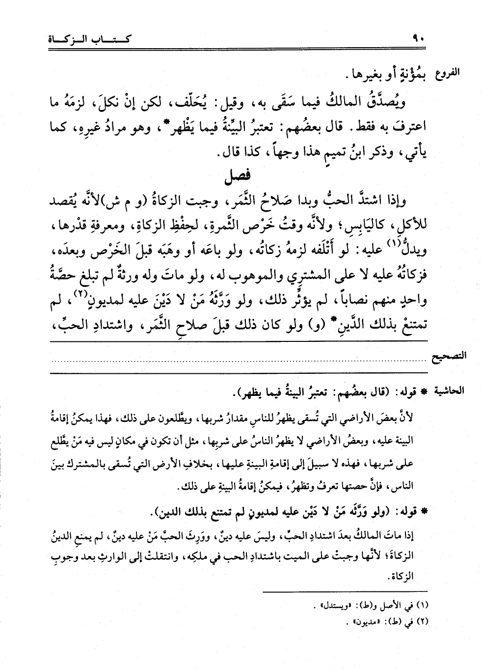 وَجَبَتْ الزَّكَاةُ "وم ش"؛ لِأَنَّهُ يُقْصَدُ لِلْأَكْلِ، كَالْيَابِسِ؛ لِأَنَّهُ وَقْتُ خَرْصِ الثَّمَرَةِ، لِحِفْظِ الزَّكَاةِ، ومعرفة قدرها، ويدل1 عَلَيْهِ لَوْ أَتْلَفَهُ لَزِمَتْهُ زَكَاتُهُ، وَلَوْ بَاعَهُ أَوْ وَهَبَهُ قَبْلَ الْخَرْصِ وَبَعْدَهُ فَزَكَاتُهُ عَلَيْهِ لَا عَلَى الْمُشْتَرِي وَالْمَوْهُوبِ لَهُ، وَلَوْ مَاتَ وَلَهُ وَرَثَةٌ لَمْ تَبْلُغْ حِصَّةُ وَاحِدٍ مِنْهُمْ نِصَابًا لَمْ يُؤَثِّرْ ذَلِكَ، وَلَوْ وَرِثَ مَنْ لا دين عليه لمديون2 لَمْ يَمْتَنِعْ بِذَلِكَ الدَّيْنِ، "و" وَلَوْ كَانَ ذلك قبل صلاح الثمر واشتداد الحب