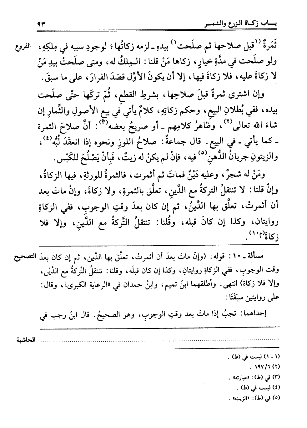 ـــــــــــــــــــــــــــــQ"مَسْأَلَةٌ 10" قَوْلُهُ: وَإِنْ مَاتَ بَعْدَ أَنْ أَثْمَرَتْ تَعَلَّقَ بِهَا الدَّيْنُ، ثُمَّ إنْ كَانَ بَعْدَ وَقْتِ الْوُجُوبِ فَفِي الزَّكَاةِ رِوَايَتَانِ، وَكَذَا إنْ كَانَ قَبْلَهُ وَقُلْنَا تَنْتَقِلُ التَّرِكَةُ مَعَ الدَّيْنِ، وَإِلَّا فَلَا زَكَاةَ، انْتَهَى، وَأَطْلَقَهُمَا ابْنُ تَمِيمٍ، وَابْنُ حَمْدَانَ فِي الرِّعَايَةِ الْكُبْرَى وَقَالَ: عَلَى رِوَايَتَيْنِ سَبَقَتَا،