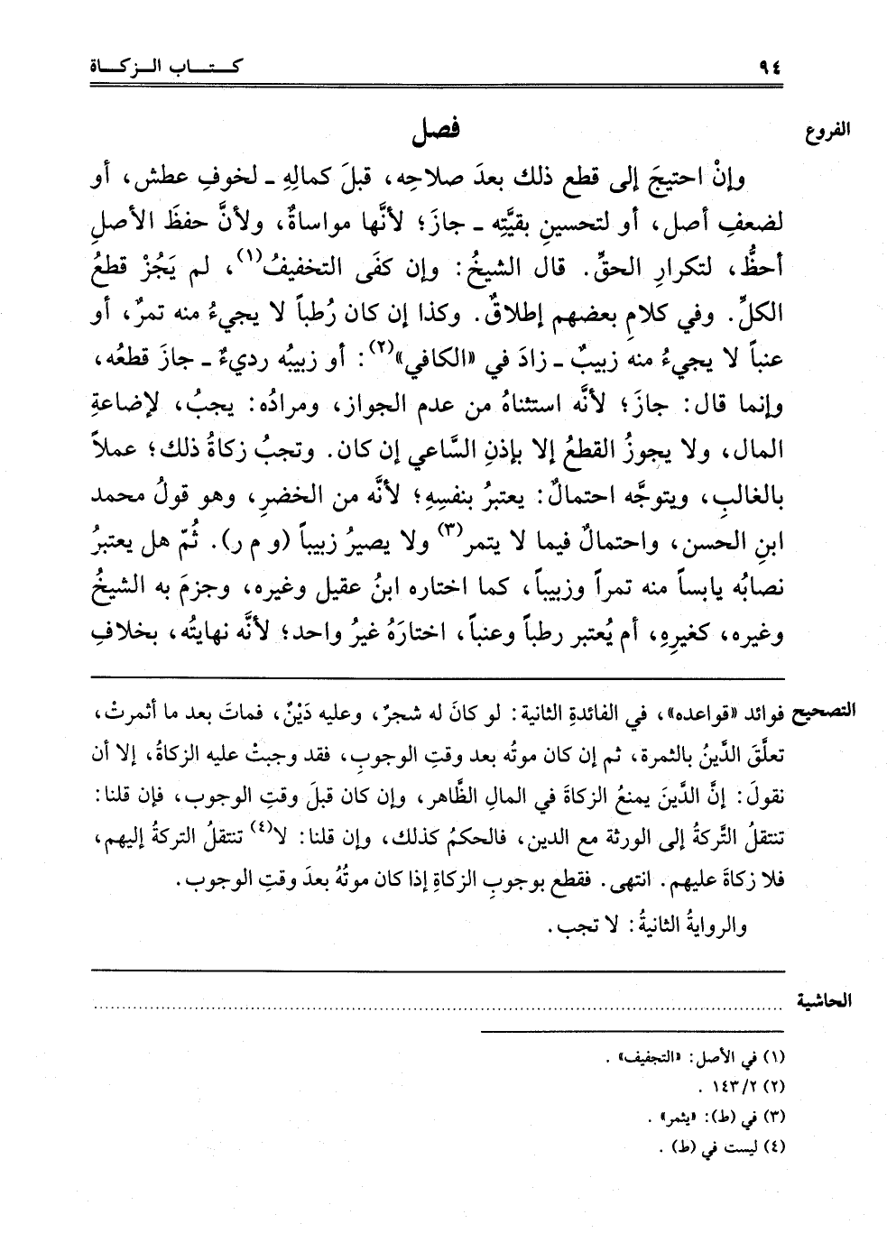 قَبْلَ كَمَالِهِ لِخَوْفِ عَطَشٍ، أَوْ لِضَعْفِ أَصْلٍ، أَوْ لِتَحْسِينِ بَقِيَّتِهِ جَازَ؛ لِأَنَّهَا مُوَاسَاةٌ، وَلِأَنَّ حِفْظَ الْأَصْلِ أَحَظُّ، لِتَكَرُّرِ الْحَقِّ، قَالَ الشَّيْخُ: وَإِنْ كَفَى التَّخْفِيفُ1 لَمْ يَجُزْ قَطْعُ الْكُلِّ، وَفِي كَلَامِ بَعْضِهِمْ إطْلَاقٌ، وَكَذَا إنْ كَانَ رُطَبًا لَا يَجِيءُ مِنْهُ تَمْرٌ، أَوْ عِنَبًا لَا يَجِيءُ مِنْهُ زَبِيبٌ زَادَ فِي الْكَافِي2: أَوْ زَبِيبُهُ رَدِيءٌ جَازَ قَطْعُهُ، وَإِنَّمَا قَالَ: جَازَ؛ لِأَنَّهُ اسْتَثْنَاهُ مِنْ عَدَمِ الْجَوَازِ، وَمُرَادُهُ يَجِبُ لِإِضَاعَةِ الْمَالِ، وَلَا يَجُوزُ الْقَطْعُ إلَّا بِإِذْنِ السَّاعِي إنْ كَانَ. وَتَجِبُ زَكَاةُ ذَلِكَ عَمَلًا بِالْغَالِبِ، وَيَتَوَجَّهُ احْتِمَالٌ: يُعْتَبَرُ بِنَفْسِهِ؛ لِأَنَّهُ مِنْ الْخُضَرِ، وَهُوَ قَوْلُ مُحَمَّدِ بْنِ الحسن، واحتمال فيما لا يتمر3 ولا يصير زبيبا، "وم ر" ثُمَّ هَلْ يُعْتَبَرُ نِصَابًا يَابِسًا مِنْهُ تَمْرًا أَوْ زَبِيبًا كَمَا اخْتَارَهُ ابْنُ عَقِيلٍ وَغَيْرُهُ، وَجَزَمَ بِهِ الشَّيْخُ وَغَيْرُهُ، كَغَيْرِهِ أَمْ يُعْتَبَرُ رُطَبًا وَعِنَبًا؟ اخْتَارَهُ غَيْرُ وَاحِدٍ؛ لِأَنَّهُ نِهَايَتُهُ، بخلاف