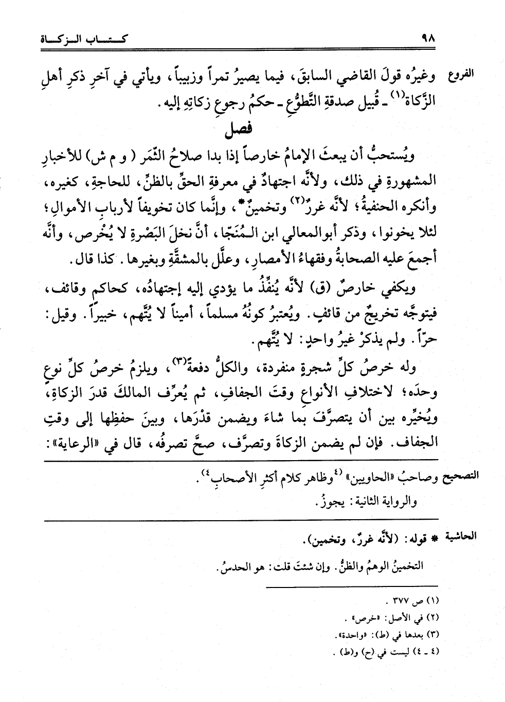 خَارِصًا إذَا بدا صلاح الثمر "وم ش" لِلْأَخْبَارِ الْمَشْهُورَةِ فِي ذَلِكَ، وَلِأَنَّهُ اجْتِهَادٌ في معرفة الحق بالظن، للحاجة كَغَيْرِهِ، وَأَنْكَرَهُ الْحَنَفِيَّةُ؛ لِأَنَّهُ غَرَرٌ1 وَتَخْمِينٌ، وَإِنَّمَا كَانَ تَخْوِيفًا لِأَرْبَابِ الْأَمْوَالِ لِئَلَّا يَخُونُوا، وَذَكَرَ أَبُو الْمَعَالِي بْنُ الْمُنَجَّى أَنَّ نَخْلَ الْبَصْرَةِ لَا يُخْرَصُ، وَأَنَّهُ أَجْمَعَ عَلَيْهِ الصَّحَابَةُ وَفُقَهَاءُ الْأَمْصَارِ، وَعُلِّلَ بِالْمَشَقَّةِ وَبِغَيْرِهَا، كَذَا قَالَ.