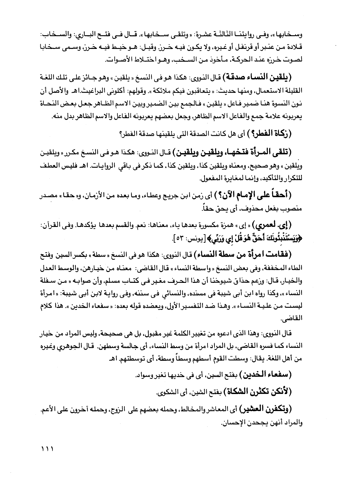 قال النووي: وهذا الذي ادعوه من تغيير الكلمة غير مقبول، بل هي صحيحة، وليس المراد من خيار النساء كما فسره القاضي، بل المراد امرأة من وسط النساء، أي جالسة وسطهن. قال الجوهري وغيره من أهل اللغة. يقال: وسطت القوم أسطهم وسطاً وسطة، أي توسطتهم. اهـ.