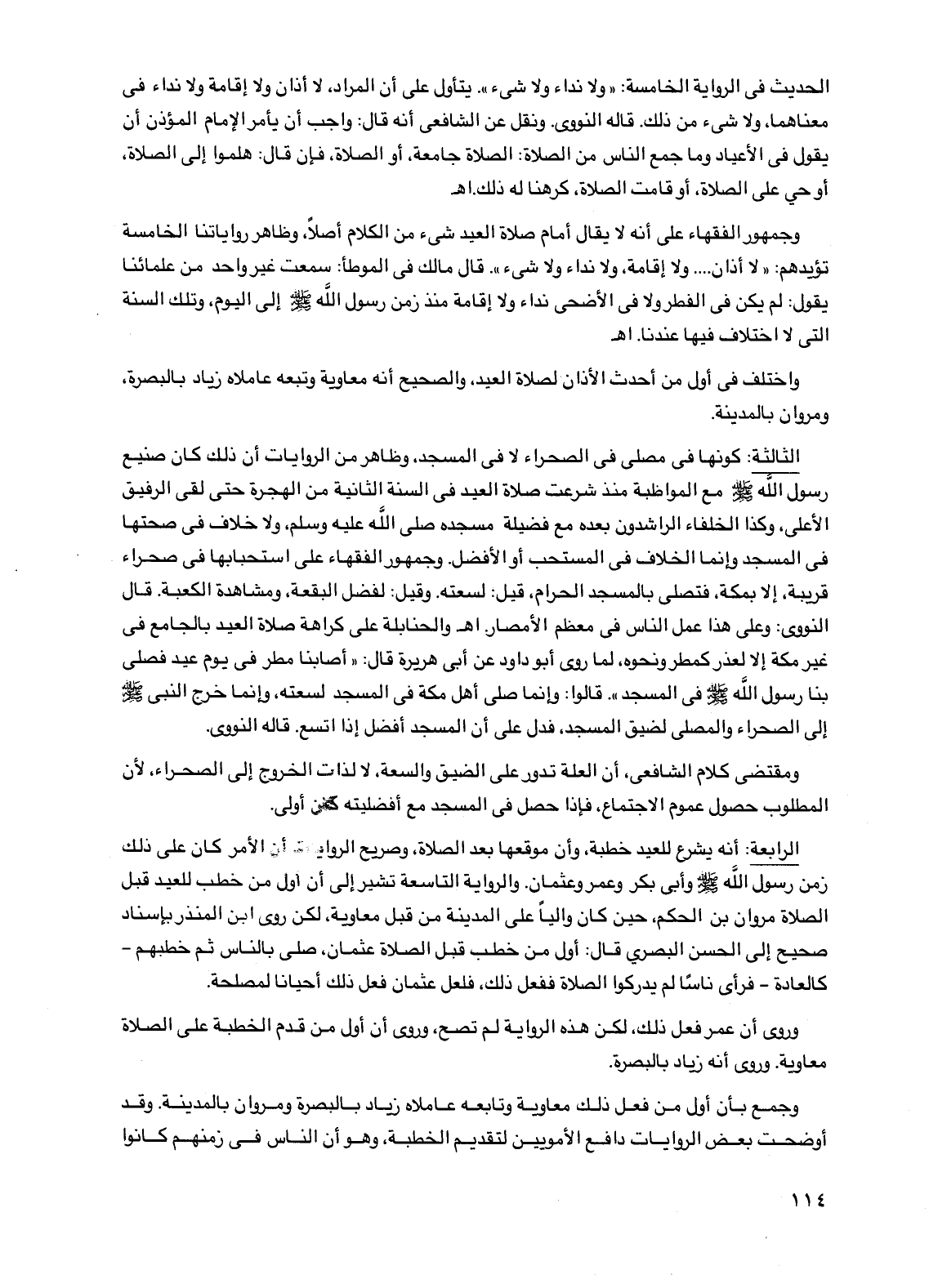 وجمهور الفقهاء على أنه لا يقال أمام صلاة العيد شيء من الكلام أصلاً، وظاهر رواياتنا الخامسة تؤيدهم: "لا أذان ... ولا إقامة، ولا نداء ولا شيء". قال مالك في الموطأ: سمعت غير واحد من علمائنا يقول: لم يكن في الفطر ولا في الأضحى نداء ولا إقامة منذ زمن رسول الله صلى الله عليه وسلم إلى اليوم، وتلك السنة التي لا اختلاف فيها عندنا. اهـ.