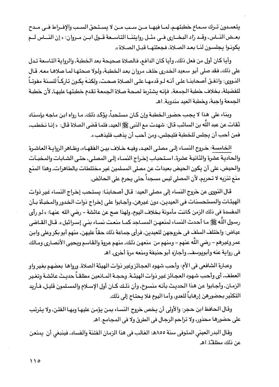 الخامسة: خروج النساء إلى مصلى العيد، وفيه خلاف بين الفقهاء، وظاهر الرواية العاشرة والحادية عشرة والثانية عشرة، استحباب إخراج النساء إلى المصلى، حتى الشابات والمخبآت والحيض، على أن يكون الحيض بعيدات عن مصلى المسلمين غير مختلطات بالطاهرات، وهذا المنع منع تنزيه لا تحريم، لأن المصلى ليس مسجداً حتى يحرم على الحائض.