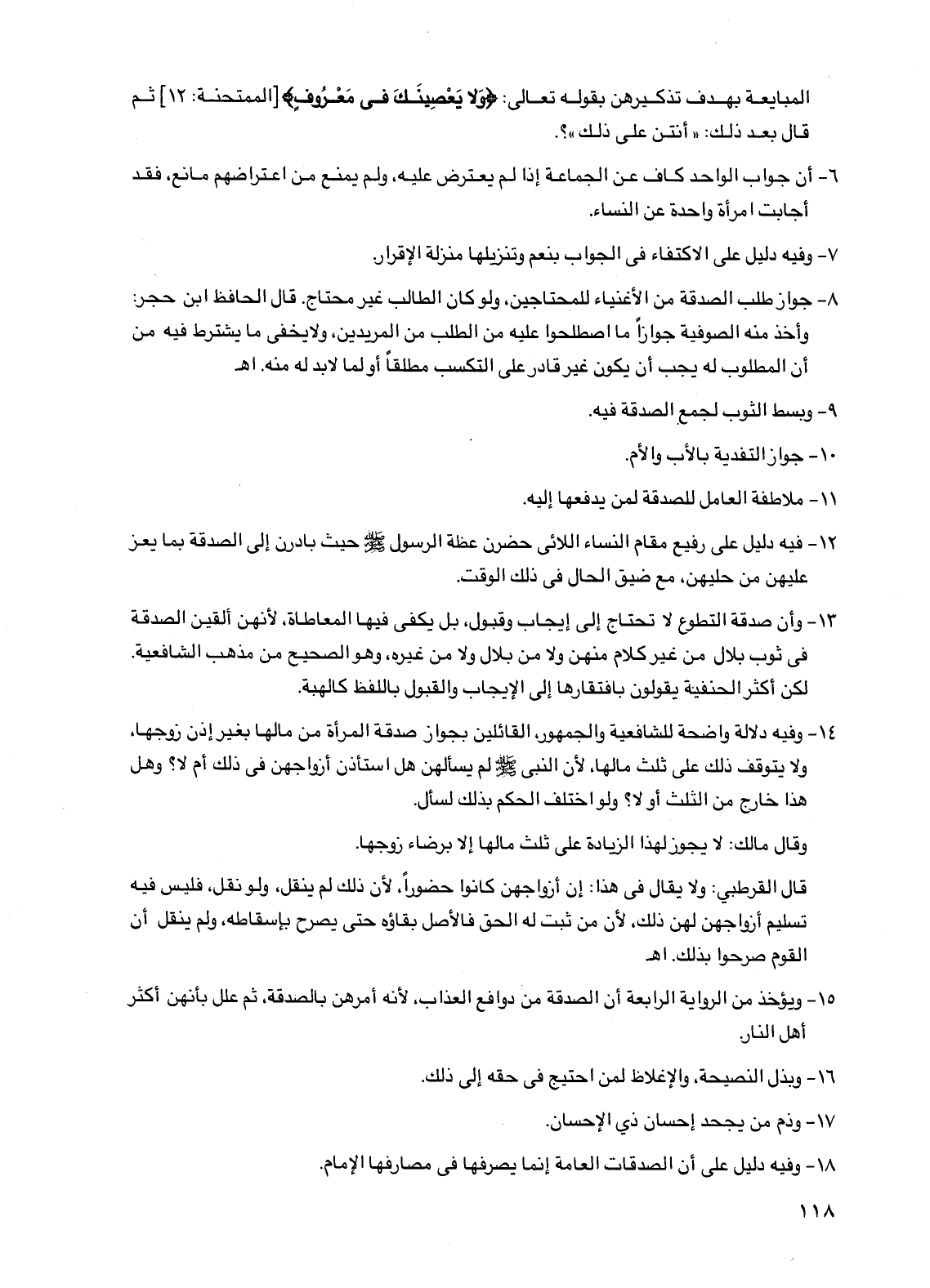 14 - وفيه دلالة واضحة للشافعية والجمهور، القائلين بجواز صدقة المرأة من مالها بغير إذن زوجها، ولا يتوقف ذلك على ثلث مالها، لأن النبي صلى الله عليه وسلم لم يسألهن هل استأذن أزواجهن في ذلك أم لا؟ وهل هذا خارج من الثلث أو لا؟ ولو اختلف الحكم بذلك لسأل.