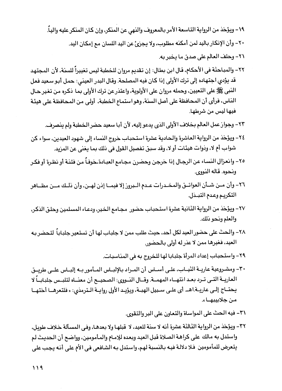 32 - ويؤخذ من الرواية الثالثة عشرة أنه لا سنة للعيد، لا قبلها ولا بعدها، وفي المسألة خلاف طويل، واستدل به مالك على كراهة الصلاة قبل العيد وبعده للإمام والمأمومين، وواضح أن الحديث لم يتعرض للمأمومين فلا دلالة فيه بالنسبة لهم، واستدل به الشافعي في الأم على أنه يجب على