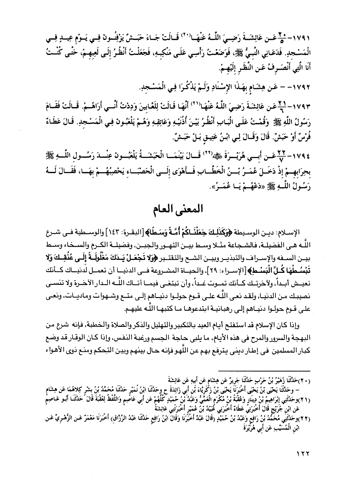 1791 - عن عائشة رضي الله عنها قالت جاء حبش يزفنون في يوم عيد في المسجد. فدعاني النبي صلى الله عليه وسلم، فوضعت رأسي على منكبه، فجعلت أنظر إلى لعبهم، حتى كنت أنا التي أنصرف عن النظر إليهم.