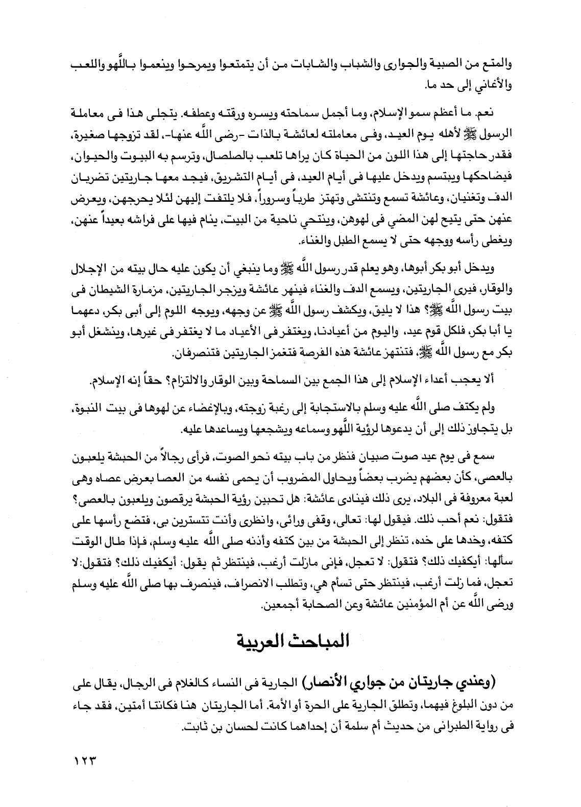 نعم. ما أعظم سمو الإسلام، وما أجمل سماحته ويسره ورقته وعطفه. يتجلى هذا في معاملة الرسول صلى الله عليه وسلم لأهله يوم العيد، وفي معاملته لعائشة بالذات -رضي الله عنها-، لقد تزوجها صغيرة، فقدر حاجتها إلى هذا اللون من الحياة كان يراها تلعب بالصلصال، وترسم به البيوت والحيوان، فيضاحكها ويبتسم ويدخل عليها في أيام العيد، في أيام التشريق، فيجد معها جاريتين تضربان الدف وتغنيان، وعائشة تسمع وتنتشي وتهتز طرباً وسروراً، فلا يلتفت إليهن لئلا يحرجهن، ويعرض عنهن حتى يتيح لهن المضي في لهوهن، وينتحي ناحية من البيت، ينام فيها على فراشه بعيداً عنهن، ويغطي رأسه ووجهه حتى لا يسمع الطبل والغناء.