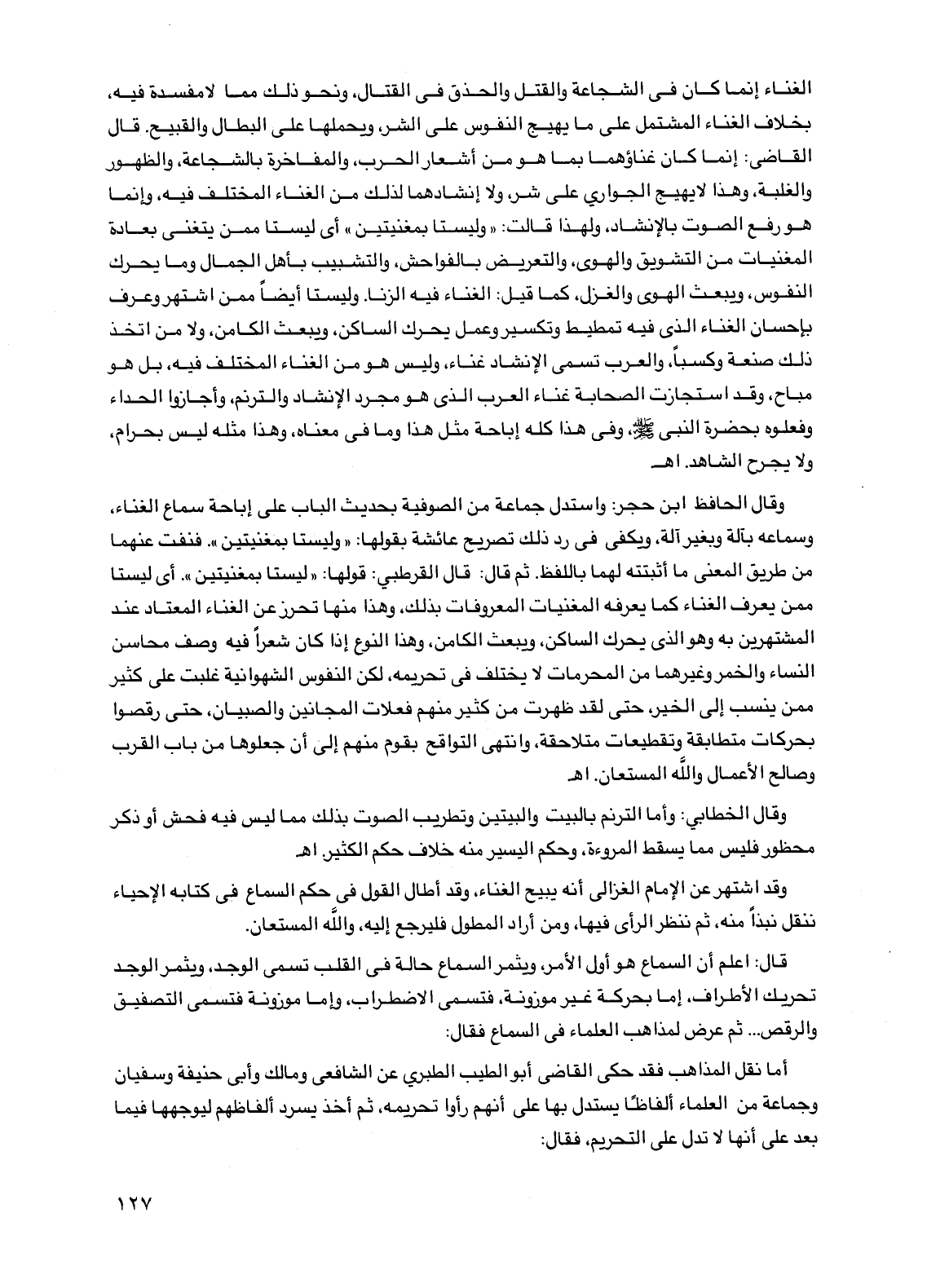 وقد اشتهر عن الإمام الغزالي أنه يبيح الغناء، وقد أطال القول في حكم السماع في كتابه الإحياء ننقل نبذاً منه، ثم ننظر الرأي فيها، ومن أراد المطول فليرجع إليه، والله المستعان.