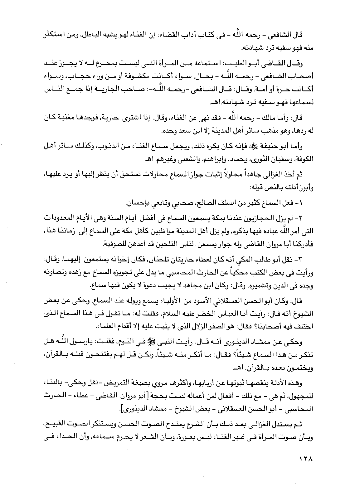 ثم يستدل الغزالي بعد ذلك بأن الشرع يمتدح الصوت الحسن ويستنكر الصوت القبيح، وبأن صوت المرأة في غير الغناء ليس بعورة، وبأن الشعر لا يحرم سماعه، وأن الحداء في