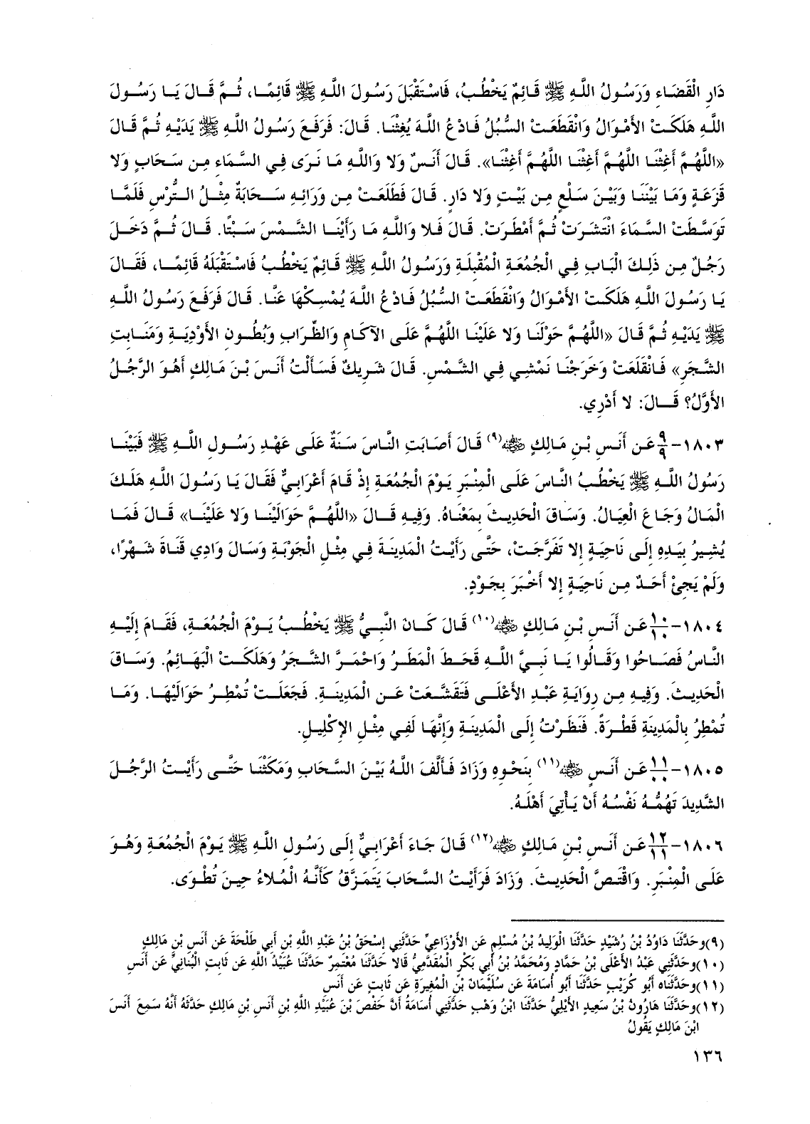 1803 - عن أنس بن مالك رضي الله عنه قال أصابت الناس سنة على عهد رسول الله صلى الله عليه وسلم فبينا رسول الله صلى الله عليه وسلم يخطب الناس على المنبر يوم الجمعة إذ قام أعرابي فقال يا رسول الله هلك المال وجاع العيال. وساق الحديث بمعناه. وفيه قال "اللهم حوالينا ولا علينا" قال فما يشير بيده إلى ناحية إلا تفرجت، حتى رأيت المدينة في مثل الجوبة وسال وادي قناة شهراً، ولم يجئ أحد من ناحية إلا أخبر بجود.