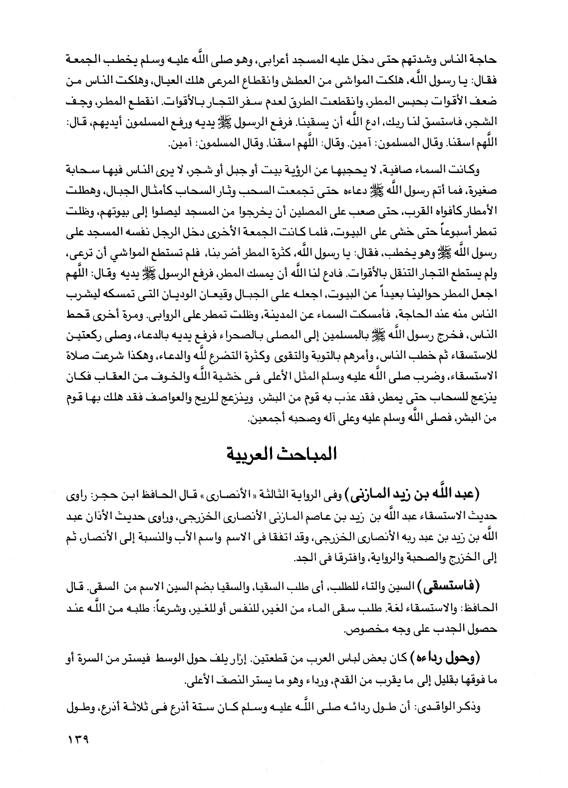 حاجة الناس وشدتهم حتى دخل عليه المسجد أعرابي، وهو صلى الله عليه وسلم يخطب الجمعة فقال: يا رسول الله، هلكت المواشي من العطش وانقطاع المرعى هلك العيال، وهلكت الناس من ضعف الأقوات بحبس المطر، وانقطعت الطرق لعدم سفر التجار بالأقوات. انقطع المطر، وجف الشجر، فاستسق لنا ربك، ادع الله أن يسقينا. فرفع الرسول صلى الله عليه وسلم يديه ورفع المسلمون أيديهم، قال: اللهم اسقنا. وقال المسلمون: آمين. وقال: اللهم اسقنا. وقال المسلمون: آمين.