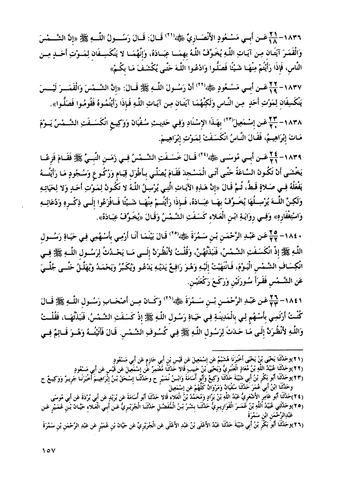 1837 - عن أبي مسعود رضي الله عنه أن رسول الله صلى الله عليه وسلم قال: "إن الشمس والقمر ليس ينكسفان لموت أحد من الناس ولكنهما آيتان من آيات الله فإذا رأيتموه فقوموا فصلوا".