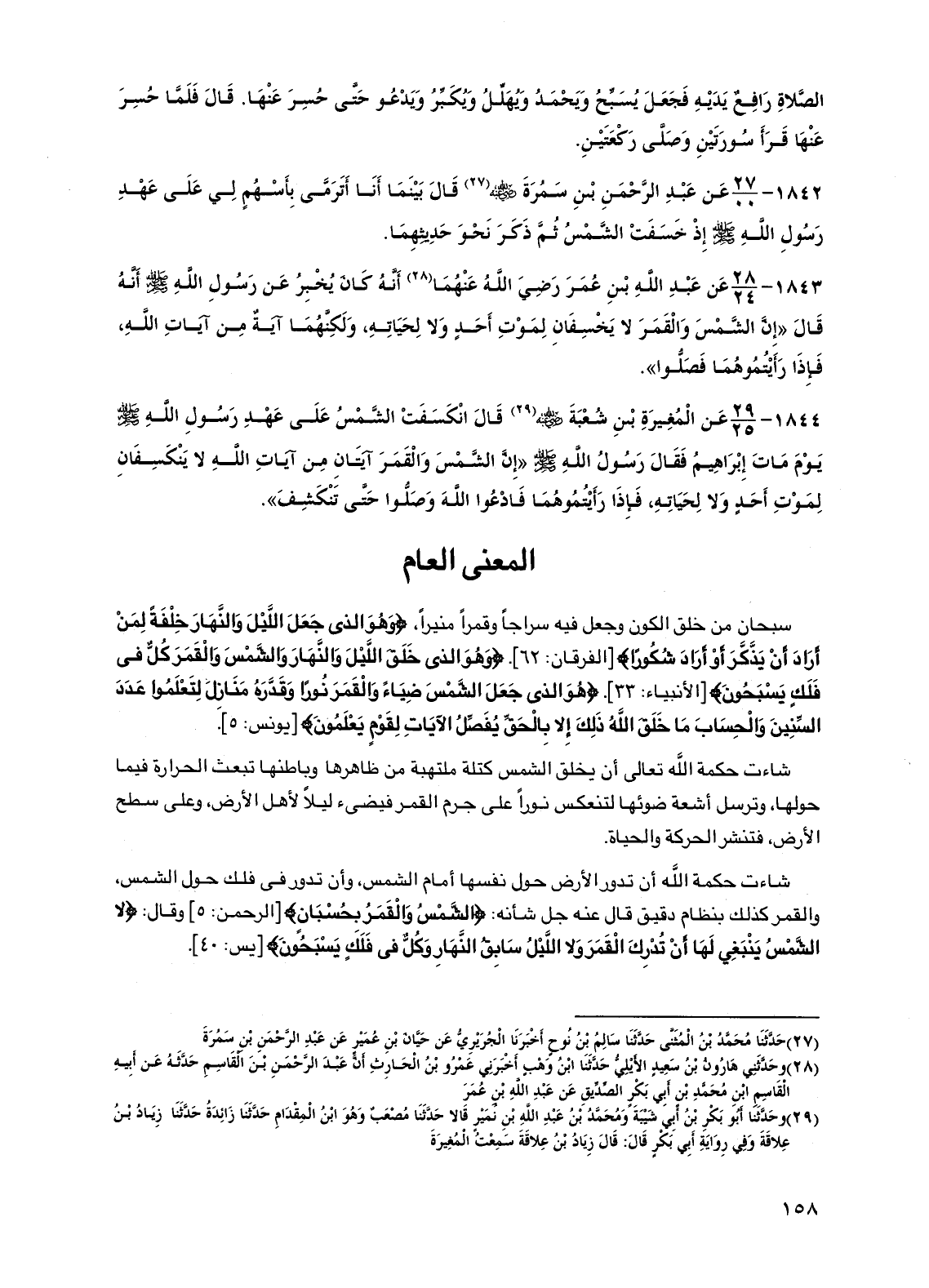 1844 - عن المغيرة بن شعبة رضي الله عنه قال انكسفت الشمس على عهد رسول الله صلى الله عليه وسلم يوم مات إبراهيم فقال رسول الله صلى الله عليه وسلم "إن الشمس والقمر آيتان من آيات الله لا ينكسفان لموت أحد ولا لحياته، فإذا رأيتموهما فادعوا الله وصلوا حتى تنكشف".