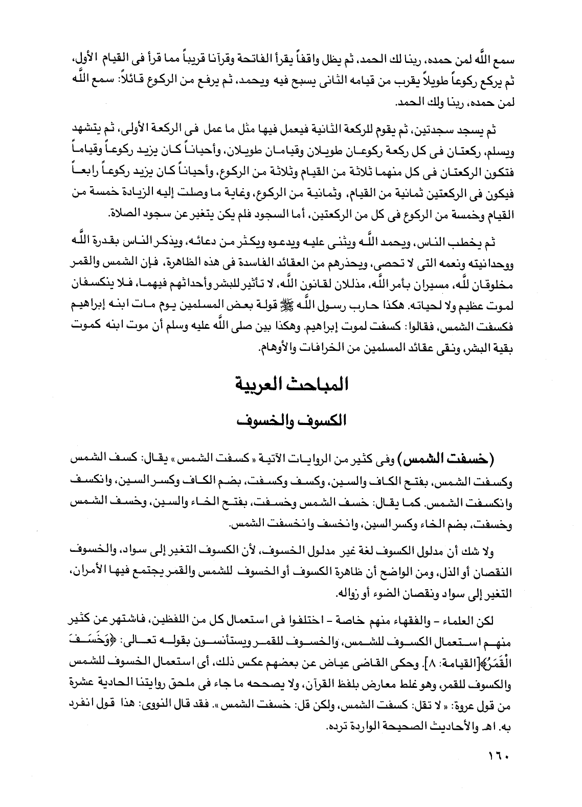 ثم يسجد سجدتين، ثم يقوم للركعة الثانية فيعمل فيها مثل ما عمل في الركعة الأولى، ثم يتشهد ويسلم، ركعتان في كل ركعة ركوعان طويلان وقيامان طويلان، وأحياناً كان يزيد ركوعاً وقياماً فتكون الركعتان في كل منهما ثلاثة من القيام وثلاثة من الركوع، وأحياناً كان يزيد ركوعاً رابعاً فيكون في الركعتين ثمانية من القيام، وثمانية من الركوع، وغاية ما وصلت إليه الزيادة خمسة من القيام وخمسة من الركوع في كل من الركعتين، أما السجود فلم يكن يتغير عن سجود الصلاة.