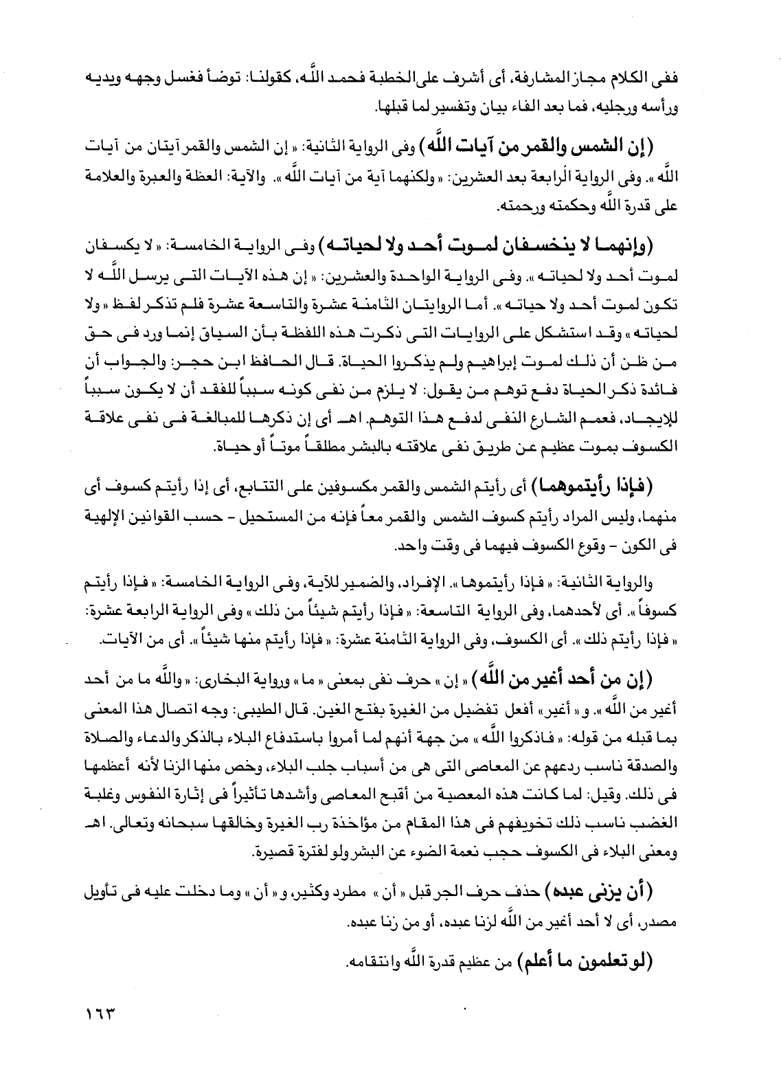 (إن الشمس والقمر من آيات الله) وفي الرواية الثانية: "إن الشمس والقمر آيتان من آيات الله". وفي الرواية الرابعة بعد العشرين: "ولكنهما آية من آيات الله". والآية: العظة والعبرة والعلامة على قدرة الله وحكمته ورحمته.