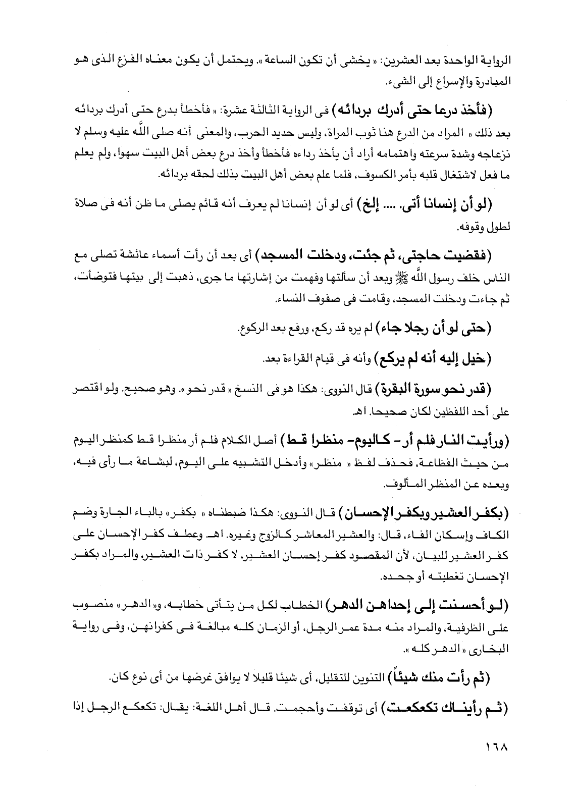 (فأخذ درعاً حتى أدرك بردائه) في الرواية الثالثة عشرة: "فأخطأ بدرع حتى أدرك بردائه بعد ذلك "المراد من الدرع هنا ثوب المرأة، وليس حديد الحرب، والمعنى أنه صلى الله عليه وسلم لانزعاجه وشدة سرعته واهتمامه أراد أن يأخذ رداءه فأخطأ وأخذ درع بعض أهل البيت سهواً، ولم يعلم ما فعل لاشتغال قلبه بأمر الكسوف، فلما علم بعض أهل البيت بذلك لحقه بردائه.