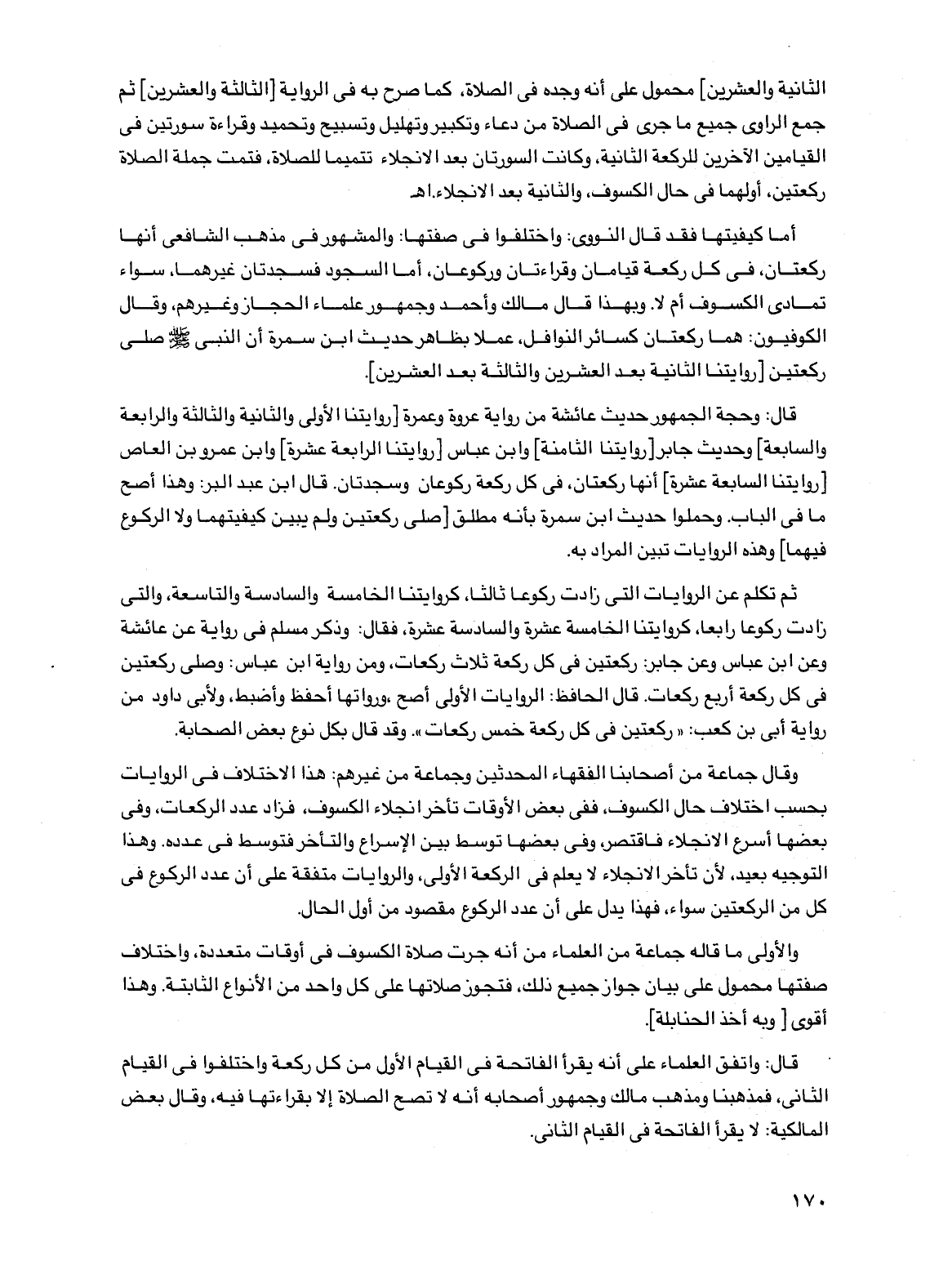 قال: وحجة الجمهور حديث عائشة من رواية عروة وعمرة [روايتنا الأولى والثانية والثالثة والرابعة والسابعة] وحديث جابر [روايتنا الثامنة] وابن عباس [روايتنا الرابعة عشرة] وابن عمرو بن العاص [روايتنا السابعة عشرة] أنها ركعتان، في كل ركعة ركوعان وسجدتان. قال ابن عبد البر: وهذا أصح ما في الباب. وحملوا حديث ابن سمرة بأنه مطلق [صلى ركعتين ولم يبين كيفيتهما ولا الركوع فيهما] وهذه الروايات تبين المراد به.