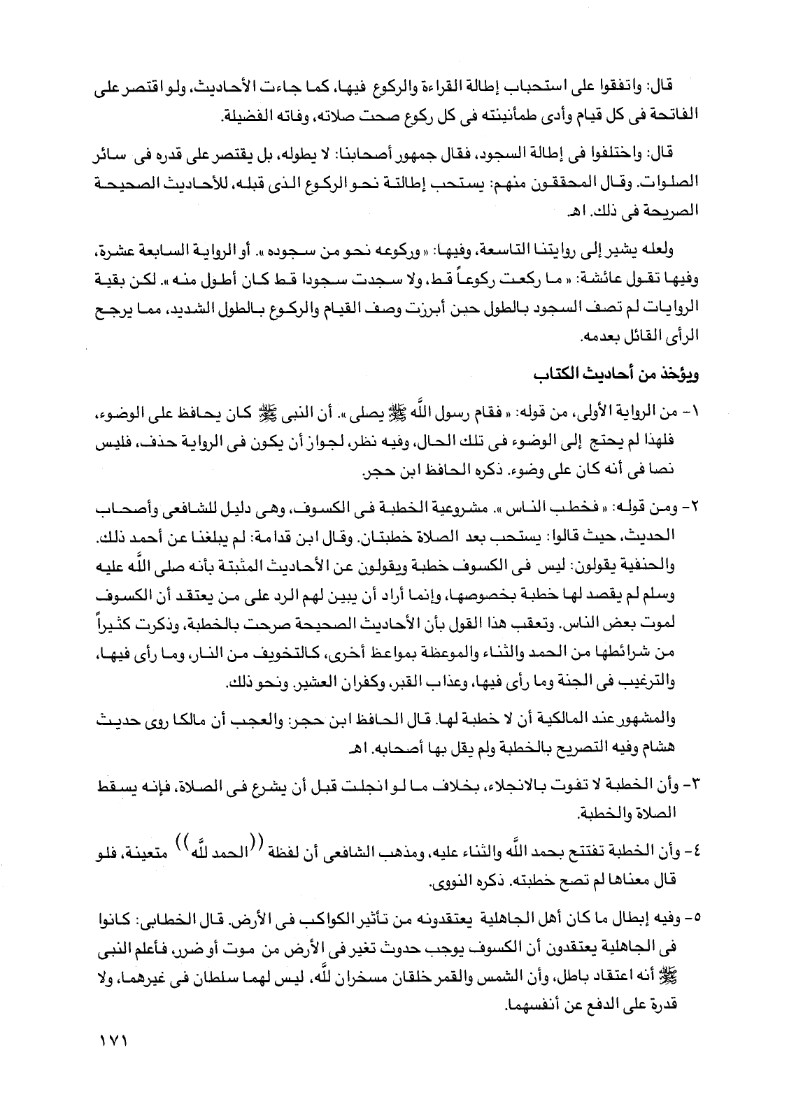 2 - ومن قوله: "فخطب الناس". مشروعية الخطبة في الكسوف، وهي دليل للشافعي وأصحاب الحديث، حيث قالوا: يستحب بعد الصلاة خطبتان. وقال ابن قدامة: لم يبلغنا عن أحمد ذلك. والحنفية يقولون: ليس في الكسوف خطبة ويقولون عن الأحاديث المثبتة بأنه صلى الله عليه وسلم لم يقصد لها خطبة بخصوصها، وإنما أراد أن يبين لهم الرد على من يعتقد أن الكسوف لموت بعض الناس. وتعقب هذا القول بأن الأحاديث الصحيحة صرحت بالخطبة، وذكرت كثيراً من شرائطها من الحمد والثناء والموعظة بمواعظ أخرى، كالتخويف من النار، وما رأى فيها، والترغيب في الجنة وما رأى فيها، وعذاب القبر، وكفران العشير. ونحو ذلك.