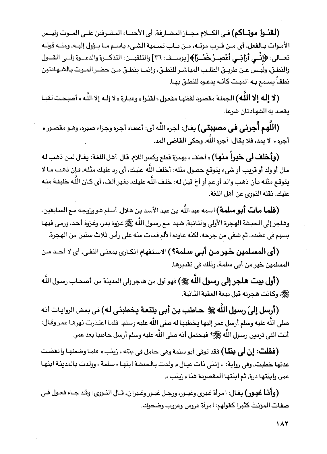 (فلما مات أبو سلمة) اسمه عبد الله بن عبد الأسد بن هلال. أسلم هو وزوجه مع السابقين، وهاجر إلى الحبشة الهجرة الأولى والثانية. شهد مع رسول الله صلى الله عليه وسلم غزوة بدر، وغزوة أحد، ورمي فيها بسهم في عضده، ثم شفي من جرحه، لكنه عاوده الألم فمات منه على رأس ثلاث سنين من الهجرة.