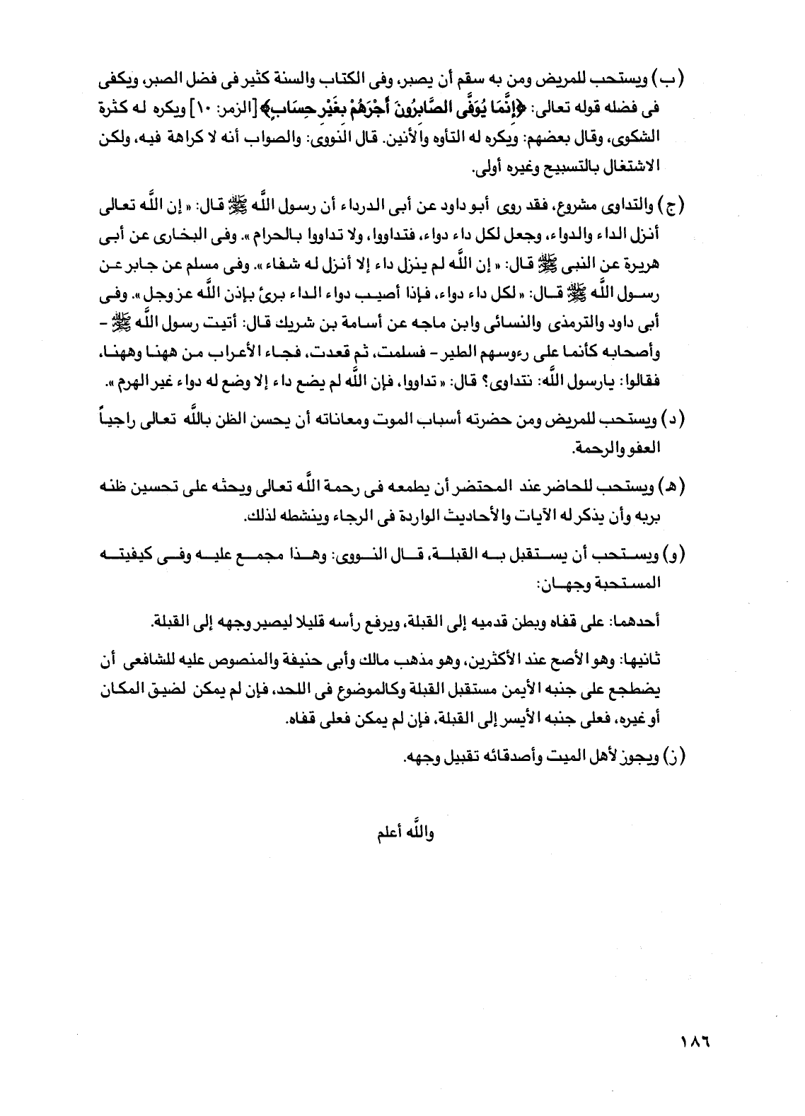 (ب) ويستحب للمريض ومن به سقم أن يصبر، وفي الكتاب والسنة كثير في فضل الصبر، ويكفي في فضله قوله تعالى: {إنما يوفى الصابرون أجرهم بغير حساب} [الزمر: 10] ويكره له كثرة الشكوى، وقال بعضهم: ويكره له التأوه والأنين. قال النووي: والصواب أنه لا كراهة فيه، ولكن الاشتغال بالتسبيح وغيره أولى.