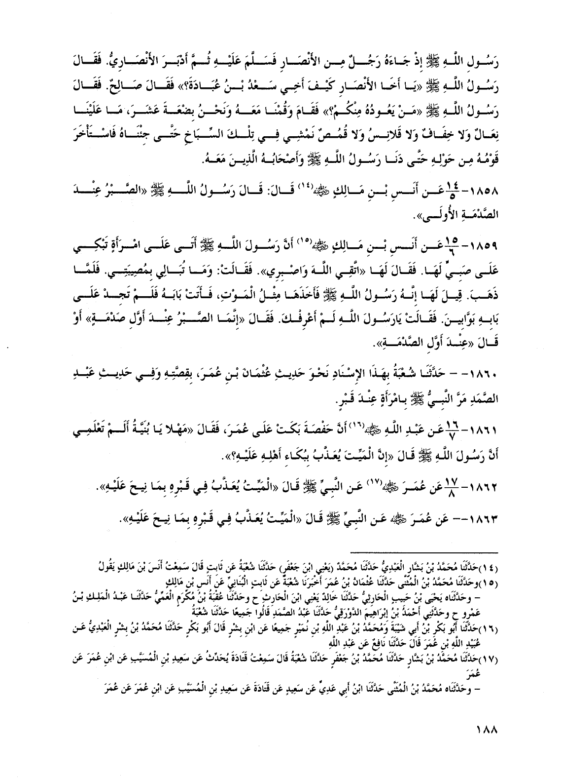 1861 - عن عبد الله رضي الله عنه أن حفصة بكت على عمر، فقال "مهلاً يا بنية ألم تعلمي أن رسول الله صلى الله عليه وسلم قال "إن الميت يعذب ببكاء أهله عليه؟ ".
