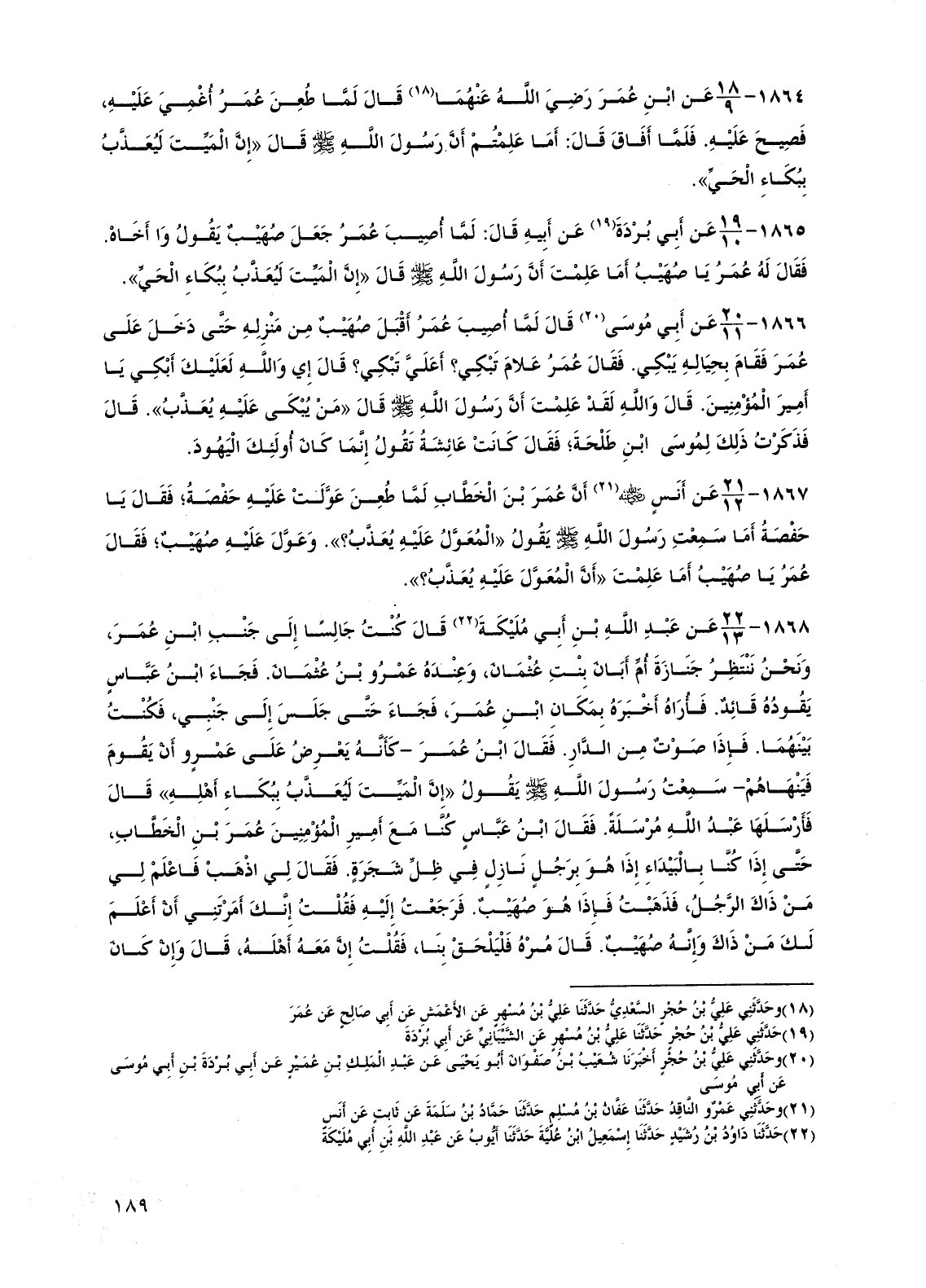 1866 - عن أبي موسى قال لما أصيب عمر أقبل صهيب من منزله حتى دخل على عمر فقام بحياله يبكي. فقال عمر علام تبكي؟ أعلي تبكي؟ قال إي والله لعليك أبكي يا أمير المؤمنين. قال والله لقد علمت أن رسول الله صلى الله عليه وسلم قال "من يبكى عليه يعذب". قال فذكرت ذلك لموسى ابن طلحة؛ فقال كانت عائشة تقول إنما كان أولئك اليهود.