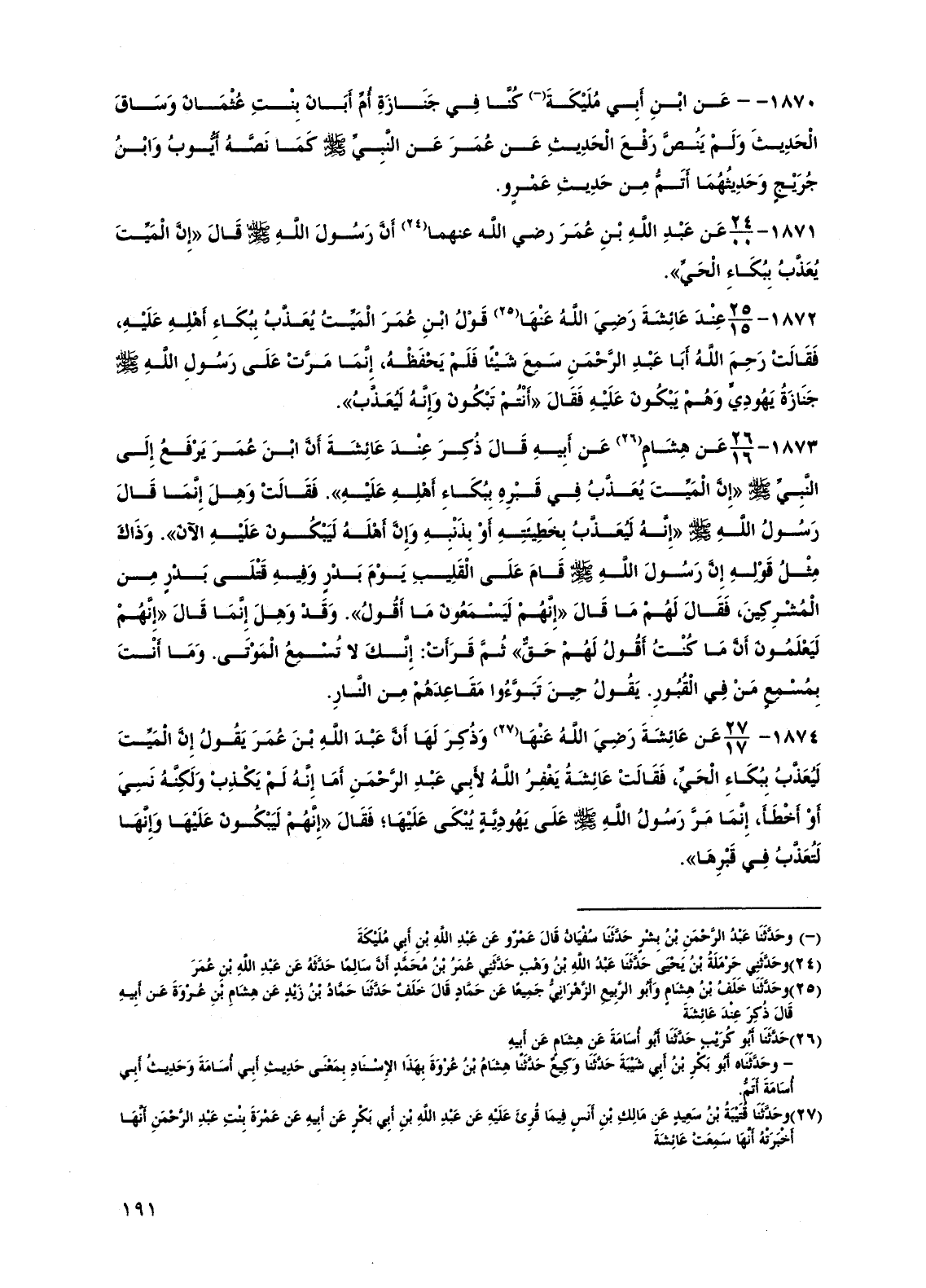 1871 - عن عبد الله بن عمر رضي الله عنهما أن رسول الله صلى الله عليه وسلم قال "إن الميت يعذب ببكاء الحي".