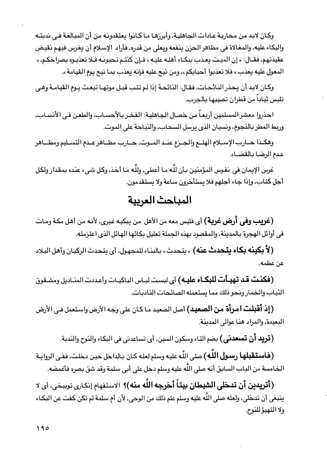 وكان لا بد من محاربة عادات الجاهلية، وأبرزها ما كانوا يعتقدونه من أن المبالغة في ندبته والبكاء عليه، والمغالاة في مظاهر الحزن ينفعه ويعلي من قدره، فأراد الإسلام أن يغرس فيهم نقيض عقيدتهم، فقال: "إن الميت يعذب ببكاء أهله عليه" فإن كنتم تحبونه فلا تعذبوه بصراخكم، "المعول عليه يعذب" فلا تعذبوا أحبابكم"، ومن نيح عليه فإنه يعذب بما نيح يوم القيامة".