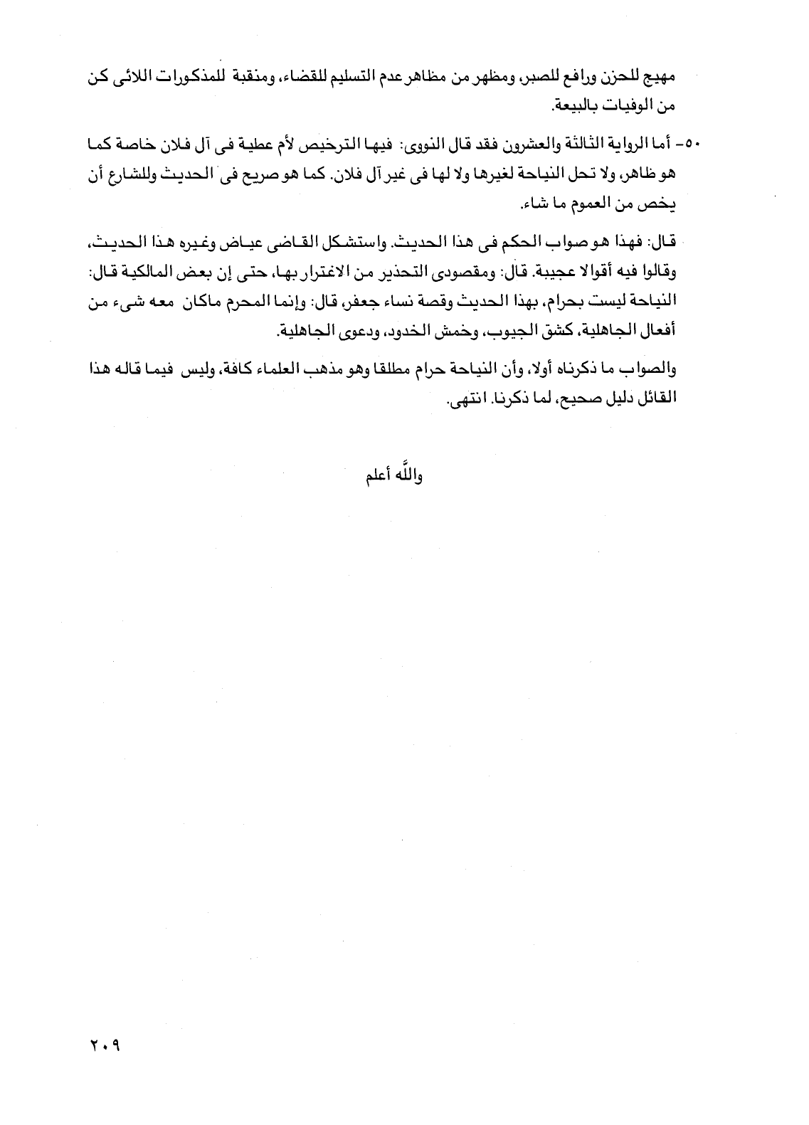 50 - أما الرواية الثالثة والعشرون فقد قال النووي: فيها الترخيص لأم عطية في آل فلان خاصة كما هو ظاهر، ولا تحل النياحة لغيرها ولا لها في غير آل فلان. كما هو صريح في الحديث وللشارع أن يخص من العموم ما شاء.