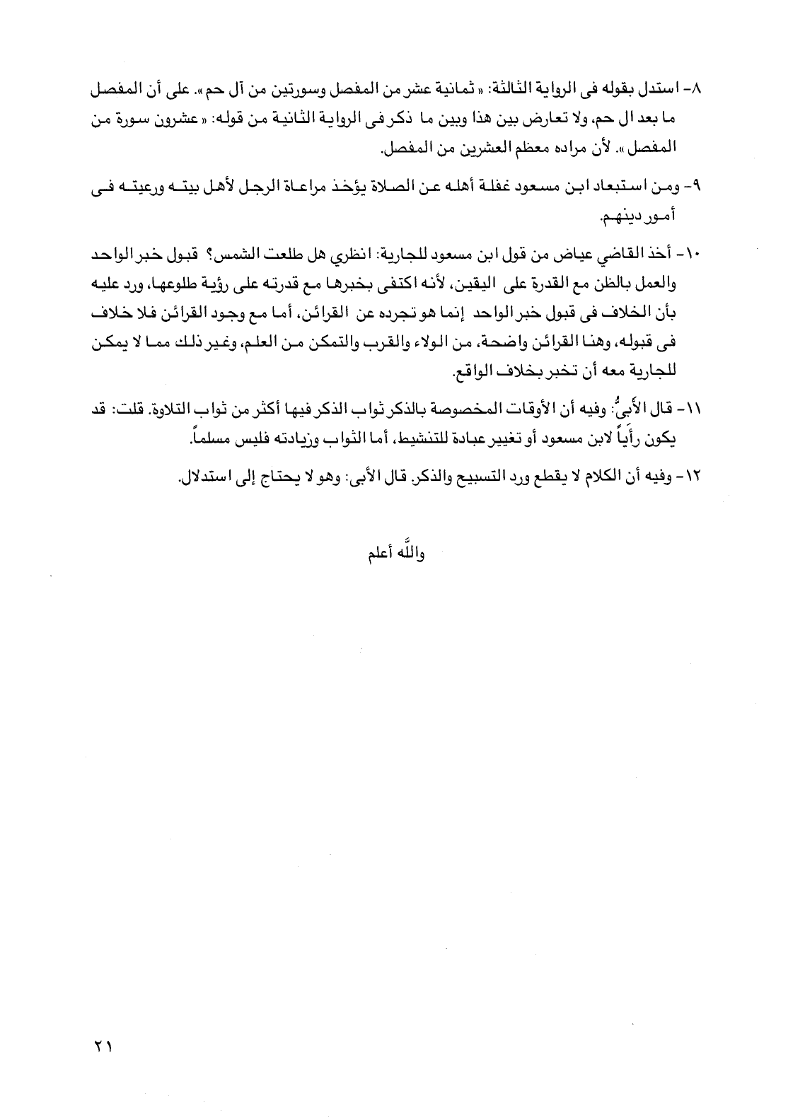 11 - قال الأبي: وفيه أن الأوقات المخصوصة بالذكر ثواب الذكر فيها أكثر من ثواب التلاوة. قلت: قد يكون رأياً لابن مسعود أو تغيير عبادة للتنشيط، أما الثواب وزيادته فليس مسلماً.