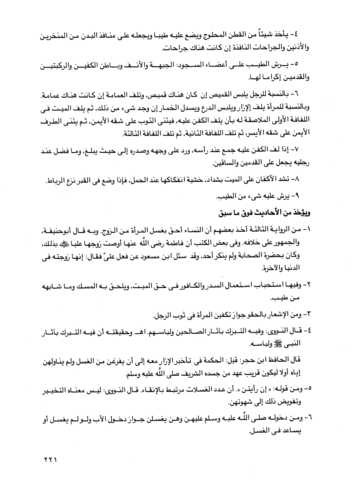 8 - تشد الأكفان على الميت بشداد، خشية انفكاكها عند الحمل. فإذا وضع في القبر نزع الرباط.