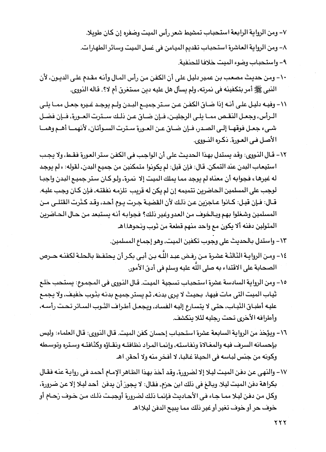 15 - ومن الرواية السادسة عشرة استحباب تسجية الميت. قال النووي في المجموع: يستحب خلع ثياب الميت التي مات فيها، بحيث لا يرى بدنه، ثم يستر جميع بدنه بثوب خفيف، ولا يجمع عليه أطباق الثياب، حتى لا يتسارع إليه الفساد، ويجعل أطراف الثوب الساتر تحت رأسه، وأطرافه الأخرى تحت رجليه لئلا ينكشف.