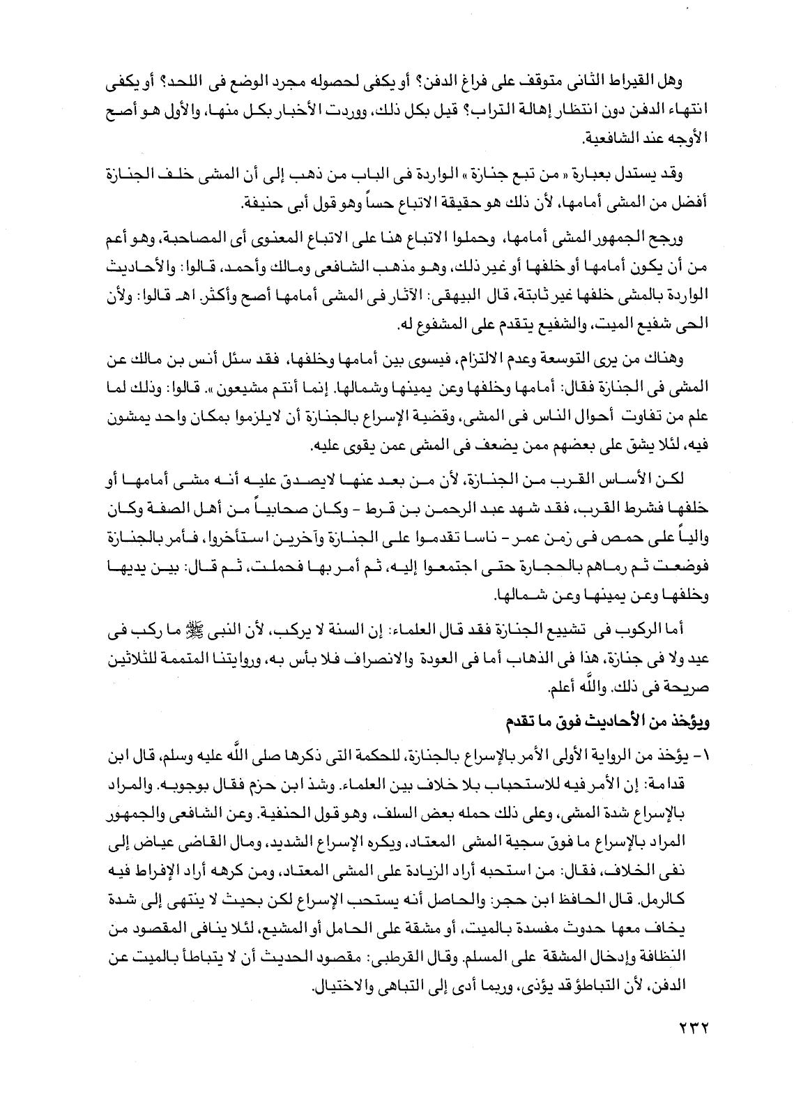ورجح الجمهور المشي أمامها، وحملوا الاتباع هنا على الاتباع المعنوي أي المصاحبة، وهو أعم من أن يكون أمامها أو خلفها أو غير ذلك، وهو مذهب الشافعي ومالك وأحمد، قالوا: والأحاديث الواردة بالمشي خلفها غير ثابتة، قال البيهقي: الآثار في المشي أمامها أصح وأكثر. اهـ قالوا: ولأن الحي شفيع الميت، والشفيع يتقدم على المشفوع له.