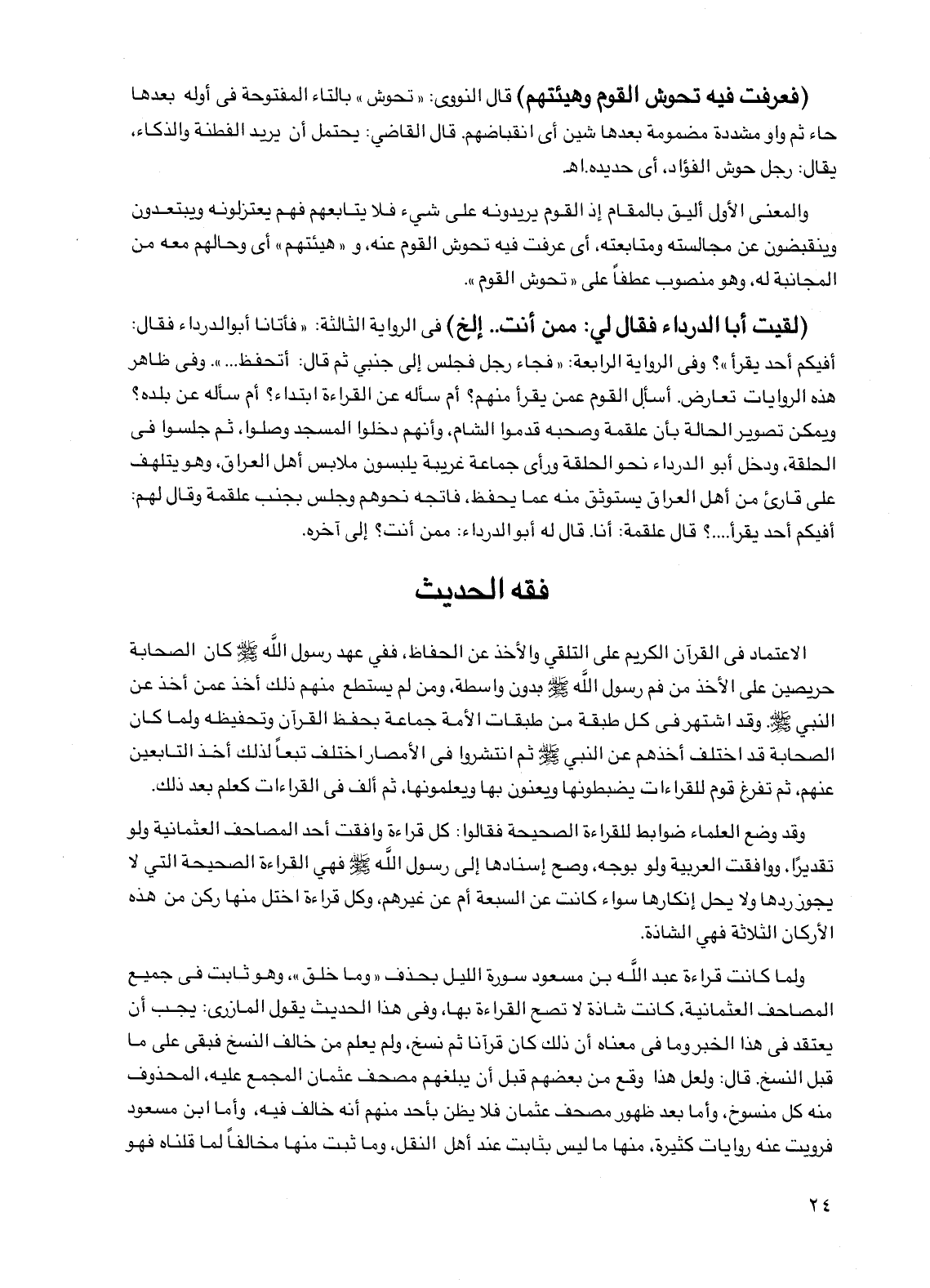 (لقيت أبا الدرداء فقال لي: ممن أنت ... إلخ) في الرواية الثالثة: "فأتانا أبو الدرداء فقال: أفيكم أحد يقرأ"؟ وفي الرواية الرابعة: "فجاء رجل فجلس إلى جنبي ثم قال: أتحفظ .... ". وفي ظاهر هذه الروايات تعارض. أسأل القوم عمن يقرأ منهم؟ أم سأله عن القراءة ابتداء؟ أم سأله عن بلده؟ ويمكن تصوير الحالة بأن علقمة وصحبه قدموا الشام، وأنهم دخلوا المسجد وصلوا، ثم جلسوا في الحلقة، ودخل أبو الدرداء نحو الحلقة ورأى جماعة غريبة يلبسون ملابس أهل العراق، وهو يتلهف على قارئ من أهل العراق يستوثق منه عما يحفظ، فاتجه نحوهم وجلس بجنب علقمة وقال لهم: أفيكم أحد يقرأ ... ؟ قال علقمة: أنا. قال له أبو الدرداء: ممن أنت؟ إلى آخره.