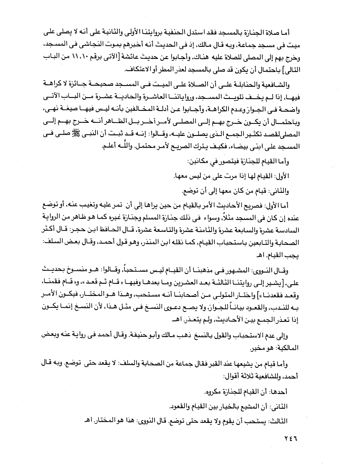 وقال النووي: المشهور في مذهبنا أن القيام ليس مستحباً، وقالوا: هو منسوخ بحديث علي، [يشير إلى روايتنا الثالثة بعد العشرين وما بعدها وفيها "قام ثم قعد"، و"قام فقمنا، وقعد فقعدنا"] واختار المتولي من أصحابنا أنه مستحب، وهذا هو المختار، فيكون الأمر به للندب، والقعود بياناً للجواز، ولا يصح دعوى النسخ في مثل هذا، لأن النسخ إنما يكون إذا تعذر الجمع بين الأحاديث، ولم يتعذر. اهـ.