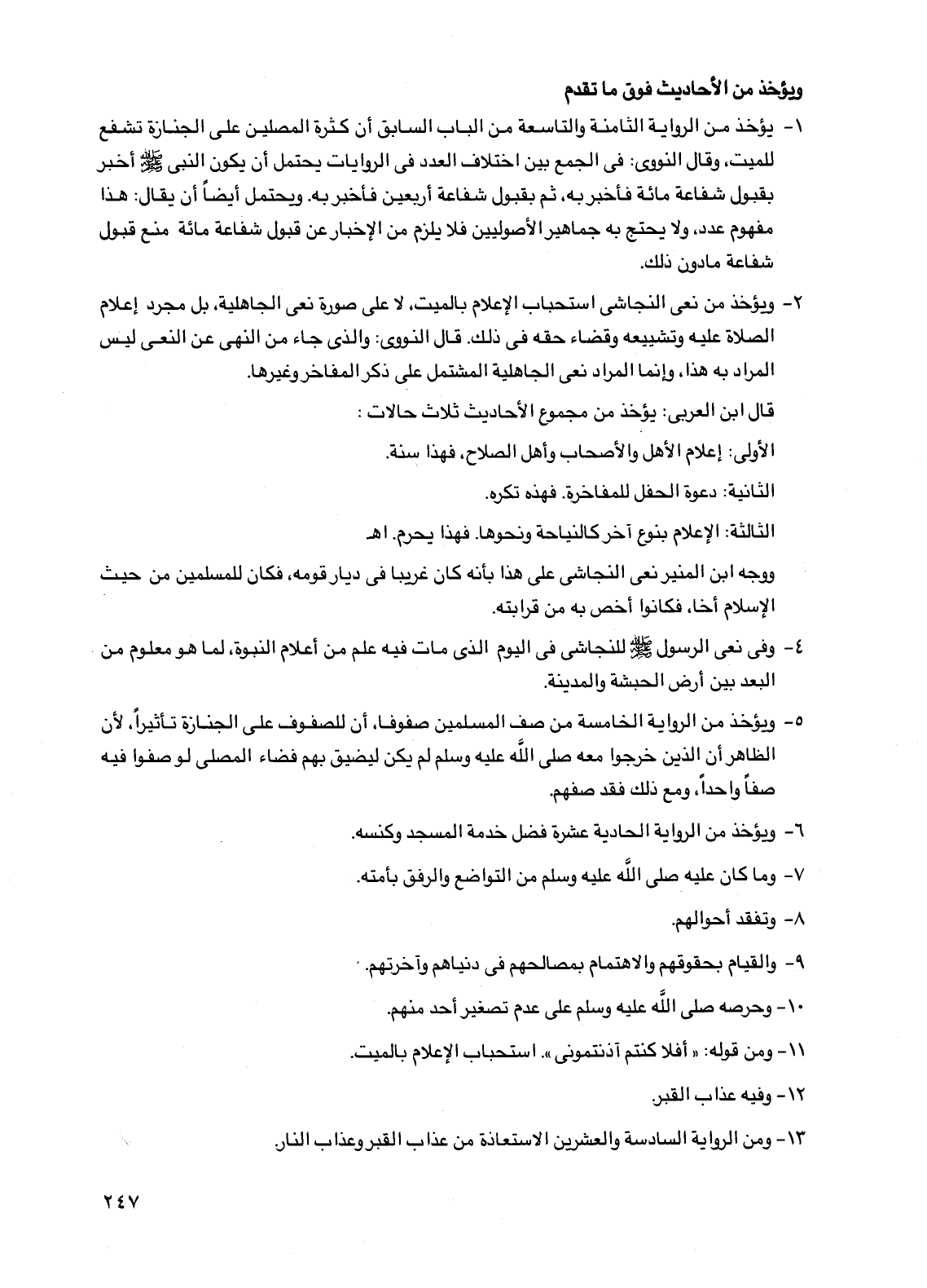 2 - ويؤخذ من نعى النجاشي استحباب الإعلام بالميت، لا على صورة نعي الجاهلية، بل مجرد إعلام الصلاة عليه وتشييعه وقضاء حقه في ذلك. قال النووي: والذي جاء من النهي عن النعي ليس المراد به هذا، وإنما المراد نعي الجاهلية المشتمل على ذكر المفاخر وغيرها.
